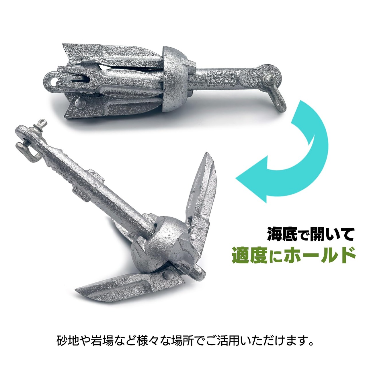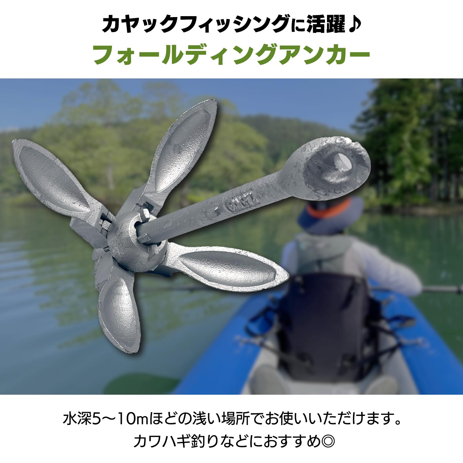 このフォールディングアンカーは、カヤックフィッシングや釣りに最適なアイテムです。砂地や岩場など、さまざまな水底に対応し、繊細な誘いが必要なカワハギ釣りなどにも活用できます。ボートアンカーとしても使用可能で、アンカーの重さを選ぶことで、流れを適度に活かすことも、しっかりと停泊することも可能です。