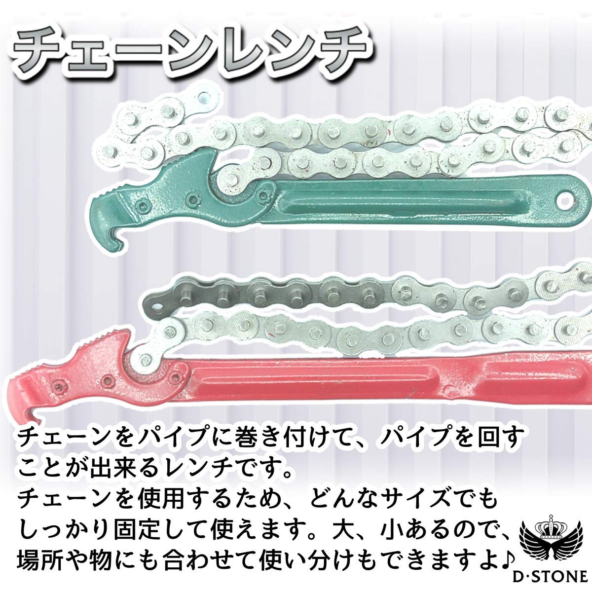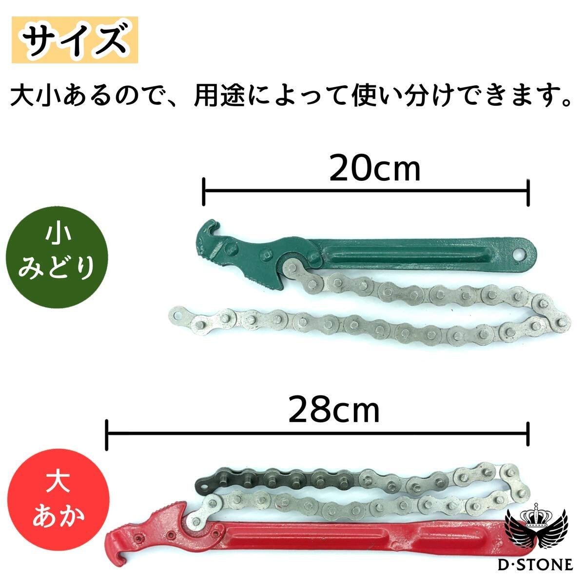 【バリエーション内容】チェーンレンチ 各サイズ1個①ハンド ル長さ:20cm、チェーン長さ: 42cm、カラー:緑②ハンドル長 さ:28cm、チェーン長さ:45cm 、カラー:赤※モニターの環境に より、色の見え方に若干差が生じ る場合がございます。また、色は在庫の関係でサイズが赤色、緑色と逆の場合もありますのでご理解あるかたのみ御購入お願いします。