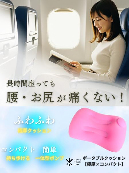 ポータブルクッション 【 極厚 × コンパクト 】 旅行 便利グッズ 飛行機 快適グッズ エアー 座布団 腰 お尻が痛くならない レジャーシート 一人用 厚手 キャンプ アウトドア ピクニック お出かけ スポーツ観戦 デスクワーク バス 軽量 厚さ12cm TOKYO TAKIBI TIME (ピンク)