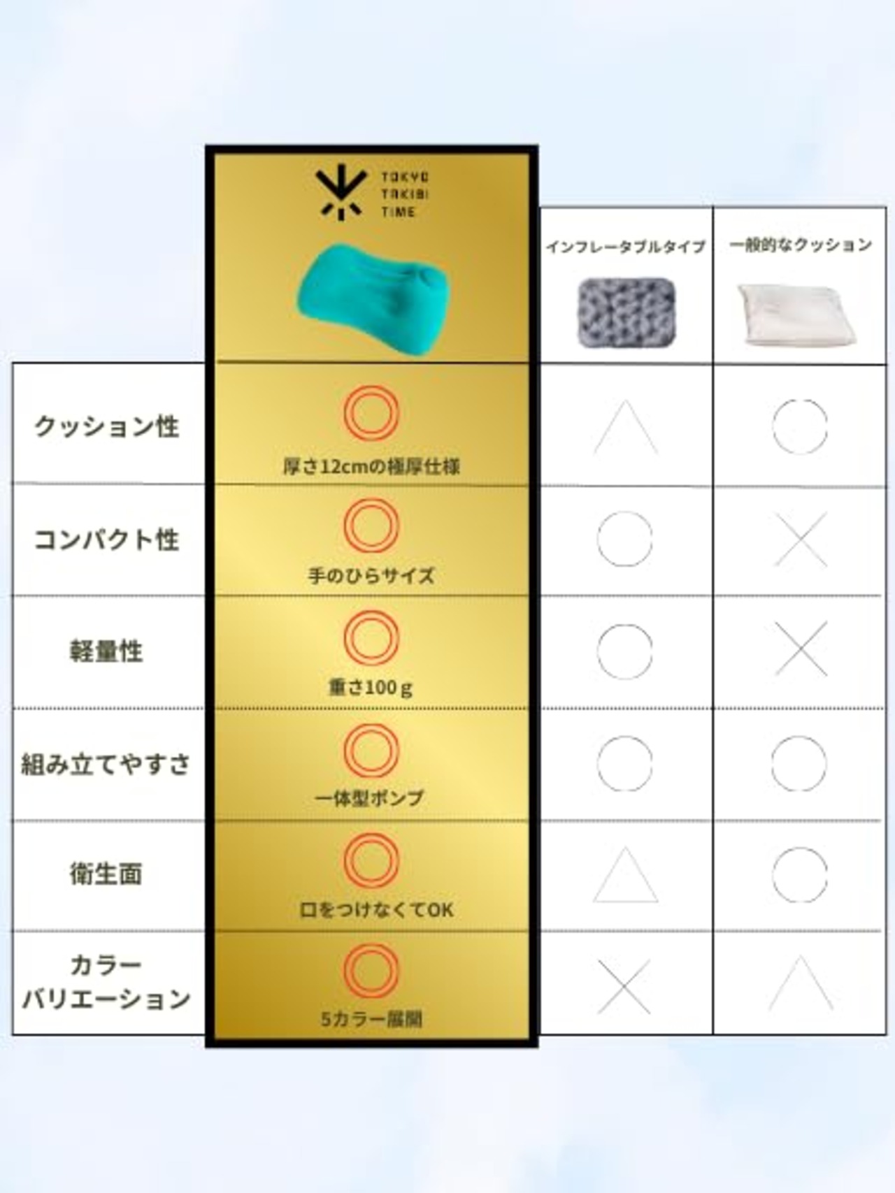【極厚×コンパクト】どこへでも持ち歩けるコンパクトなエアークッションです。厚さ12cmの極厚設計でふわふわの座り心地、収納時はバッグに収まる手のひらサイズのコンパクト設計でどこでも、どんなシーンでも快適な座り心地を楽しめます。長時間座るときのお尻や腰の痛みを軽減するのに活躍します。