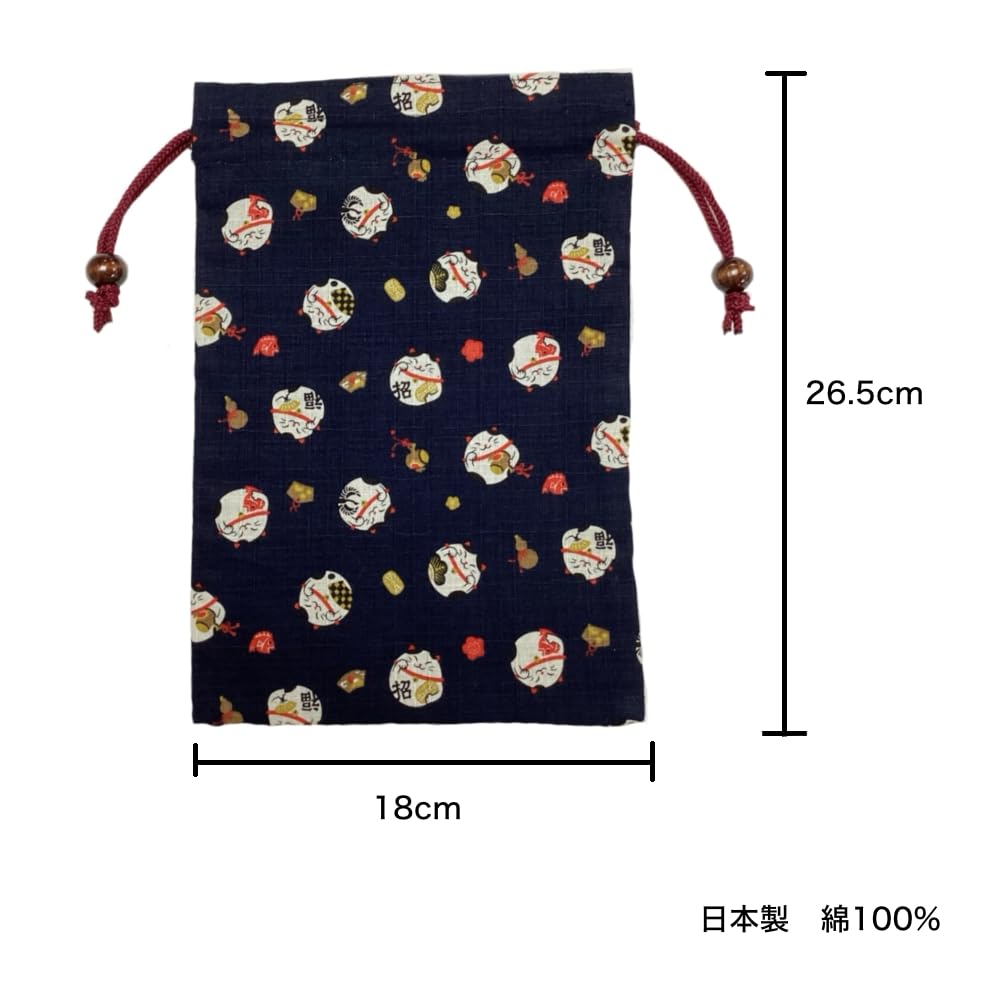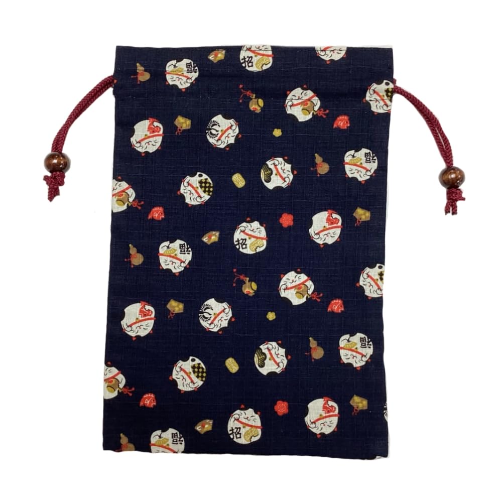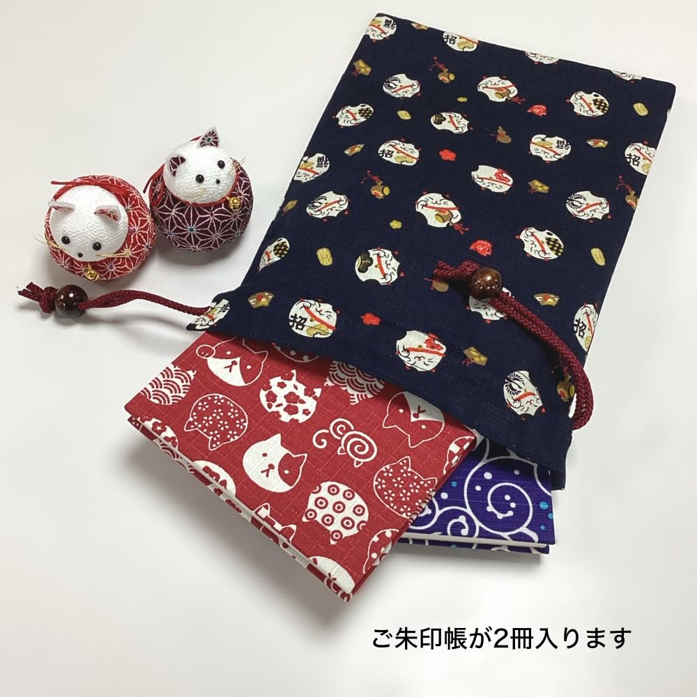 京佑 日本製 御朱印帳 ケース 巾着 袋 約26.5×18cm 縁起屋福丸ねこ 紺
