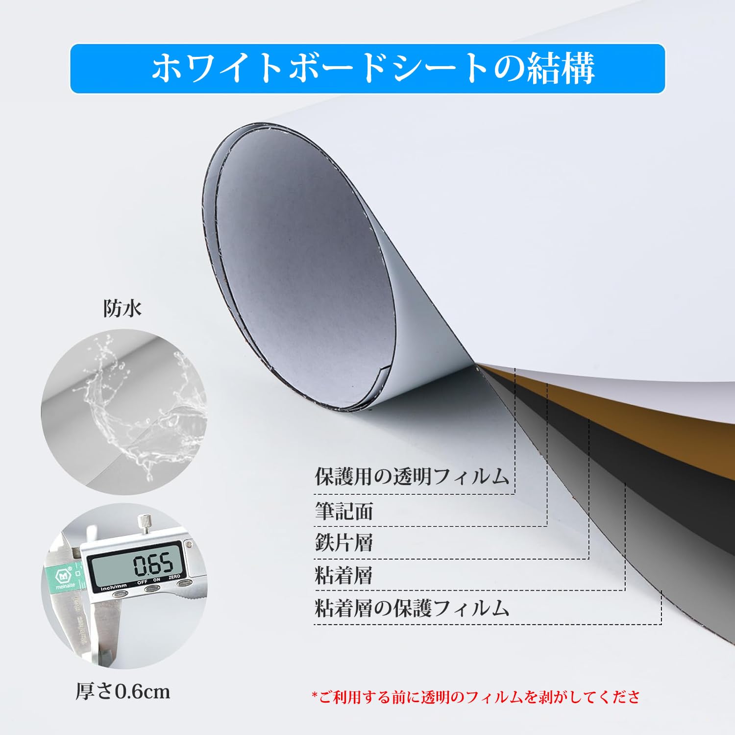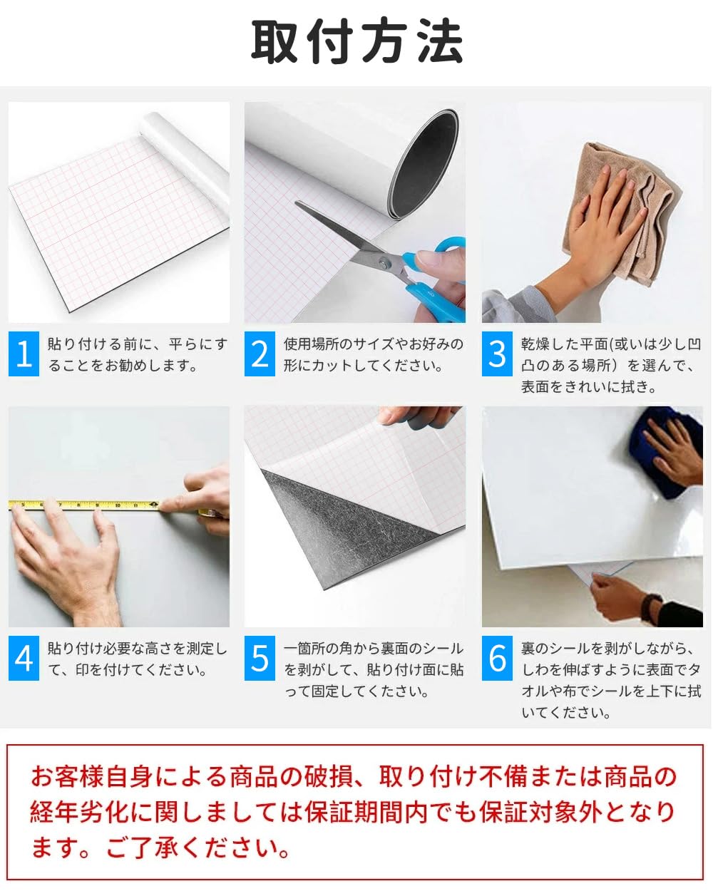 【インストールが簡単】ホワイトボード シート裏面に粘着剤が付いており、貼付剤が必要なく、貼付が簡単で、糊残りが無く。平らな壁、ガラス、キッチン、金属表面に直接貼り付けることができ、使いやすく、ただし接着部分の粘性が強いので、設置前に位置をよく確認して正しい場所に貼り付け、押さえながらゆっくり貼り付けてください。女性の方やお年寄りでもお気軽に使えます。* 使用する前に透明フィルムをはがしてください。