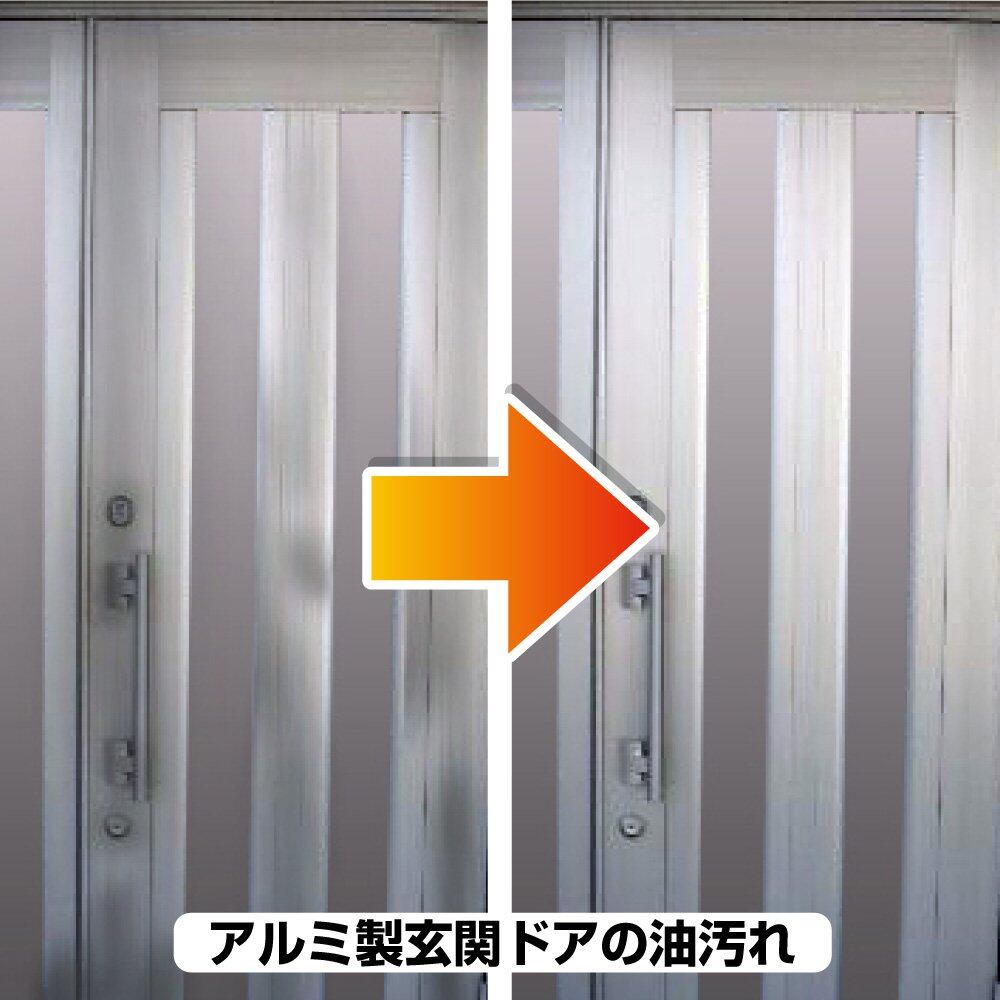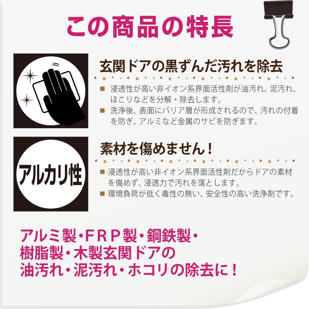 【特長】 ■[色々な汚れを分解]浸透性が高い非イオン系界面活性剤がドアの素材を傷めずに油汚れ、泥汚れ、ほこりなどを分解・除去します。 ■[汚れからガード]洗浄後、表面にバリア層が形成されるので、汚れの付着を防ぎ、アルミなど金属のサビを防ぎます。 ■[環境と肌に優しい]水を主成分とした水系洗浄剤だから、安全で手肌・環境にやさしい。【用途】 ドアの油汚れ・泥汚れ・ホコリの除去に アルミ製 / FRP製 / 鋼鉄製 / 樹脂製 / 木製ドア【使用量目安】[100ml]平方メートル:約 1.5 ~ 3m2【注意事項】 ■[保護手袋を使用してください]ご使用時は保護手袋を着用して下さい。 ■[まずは目立たない所で]使用前に目立たない所で試し、汚れ落ちや部材への影響を確認して下さい。