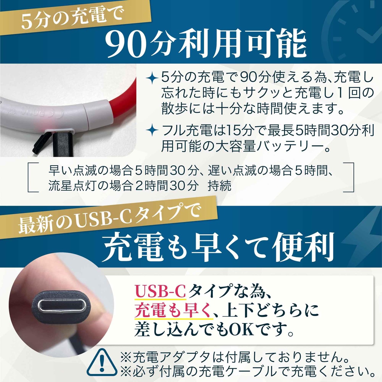 ?【5分の充電で最大90分使用可能】散歩前にさっさっと充電して十分な時間点灯するため、充電し忘れていた時も簡単に準備できます。