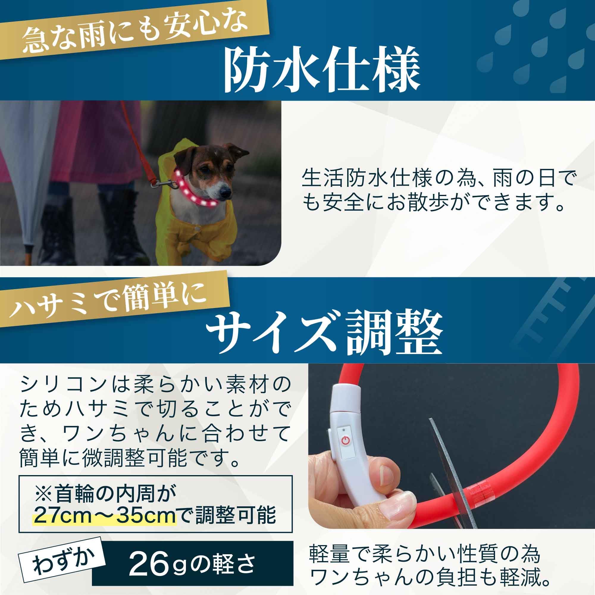 【光る首輪】鮮やかに光る首輪が、夜道や朝方、雨の日など薄暗い時のお散歩時に大切なワンちゃんを事故から守れます。