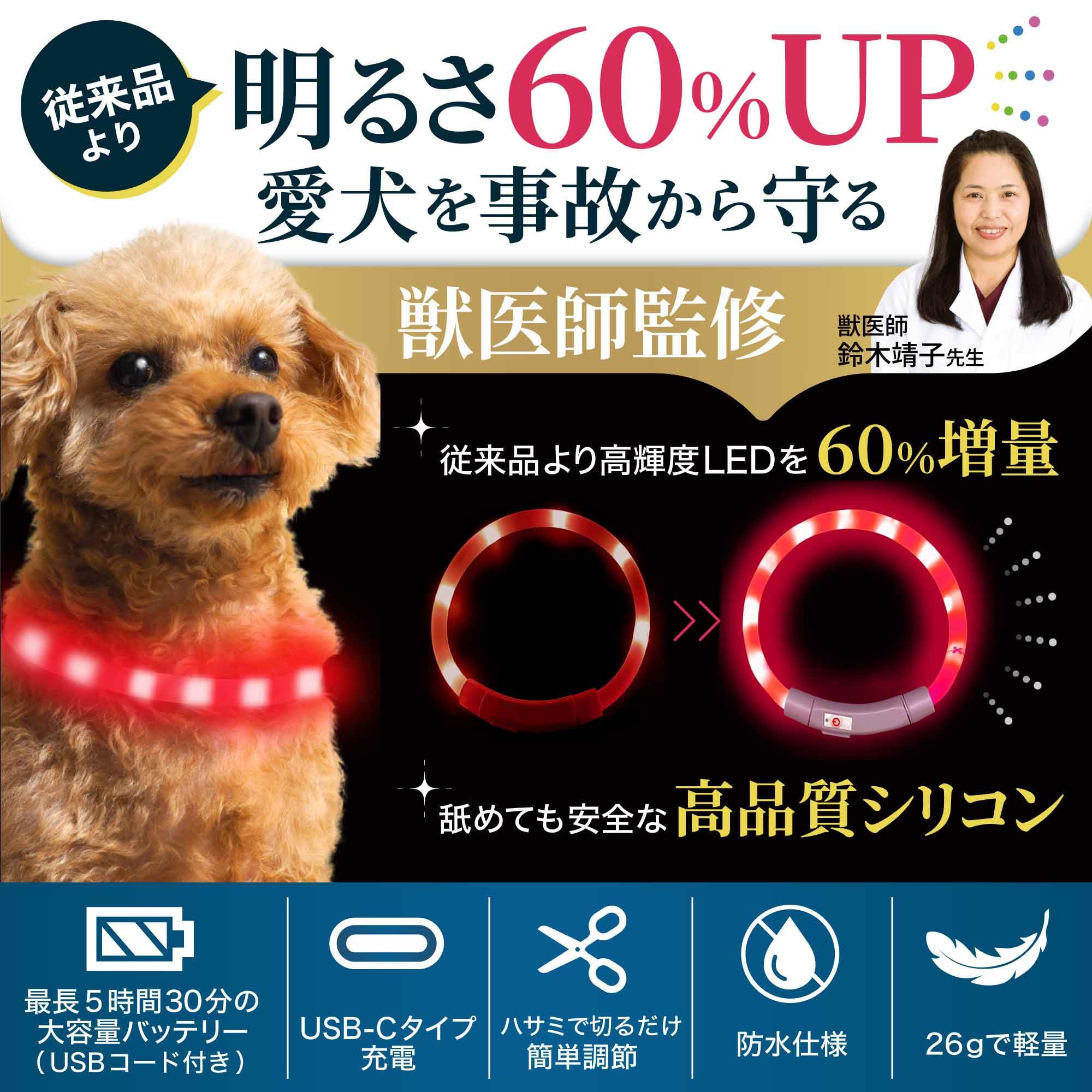 【獣医師監修】光る首輪 【LED増量で明るさ60%UP】犬 散歩 ライト 小型犬 ペット用品 メディホームプラス (レッド, 35cm)