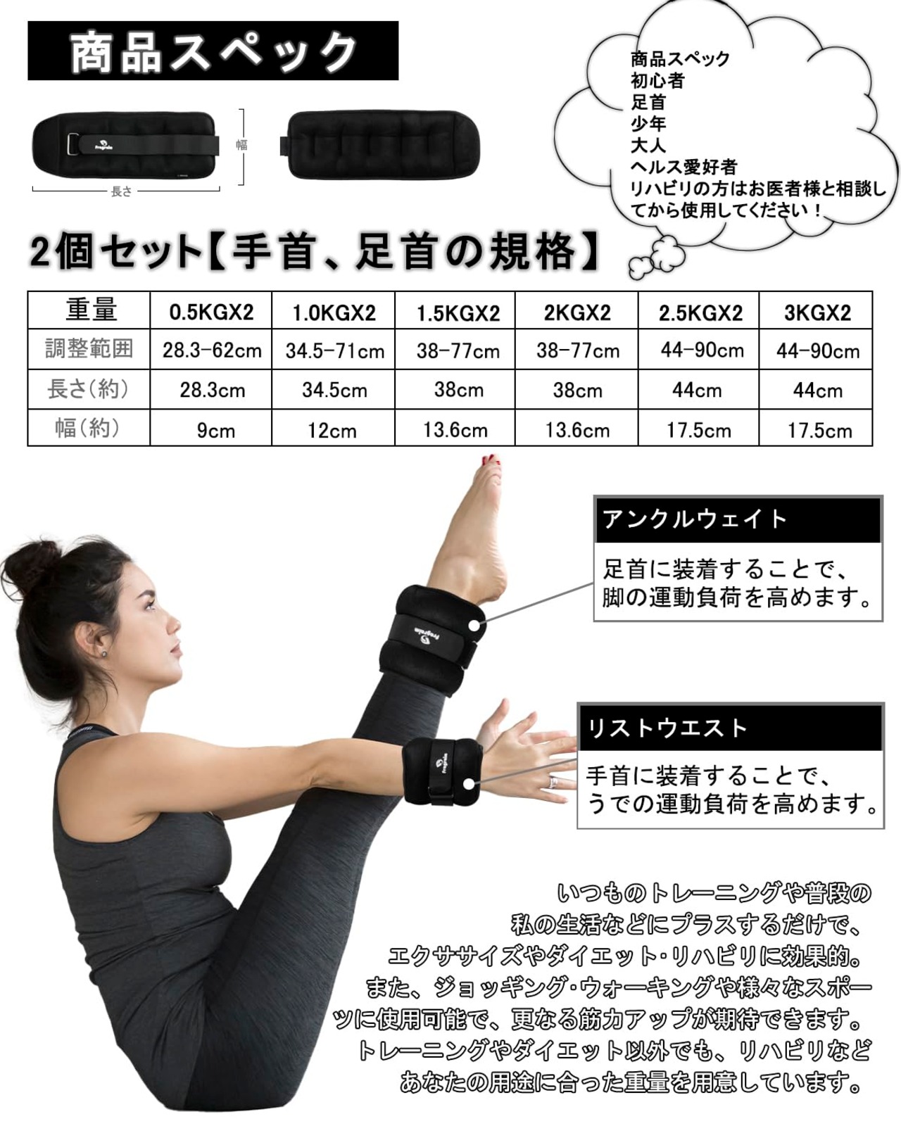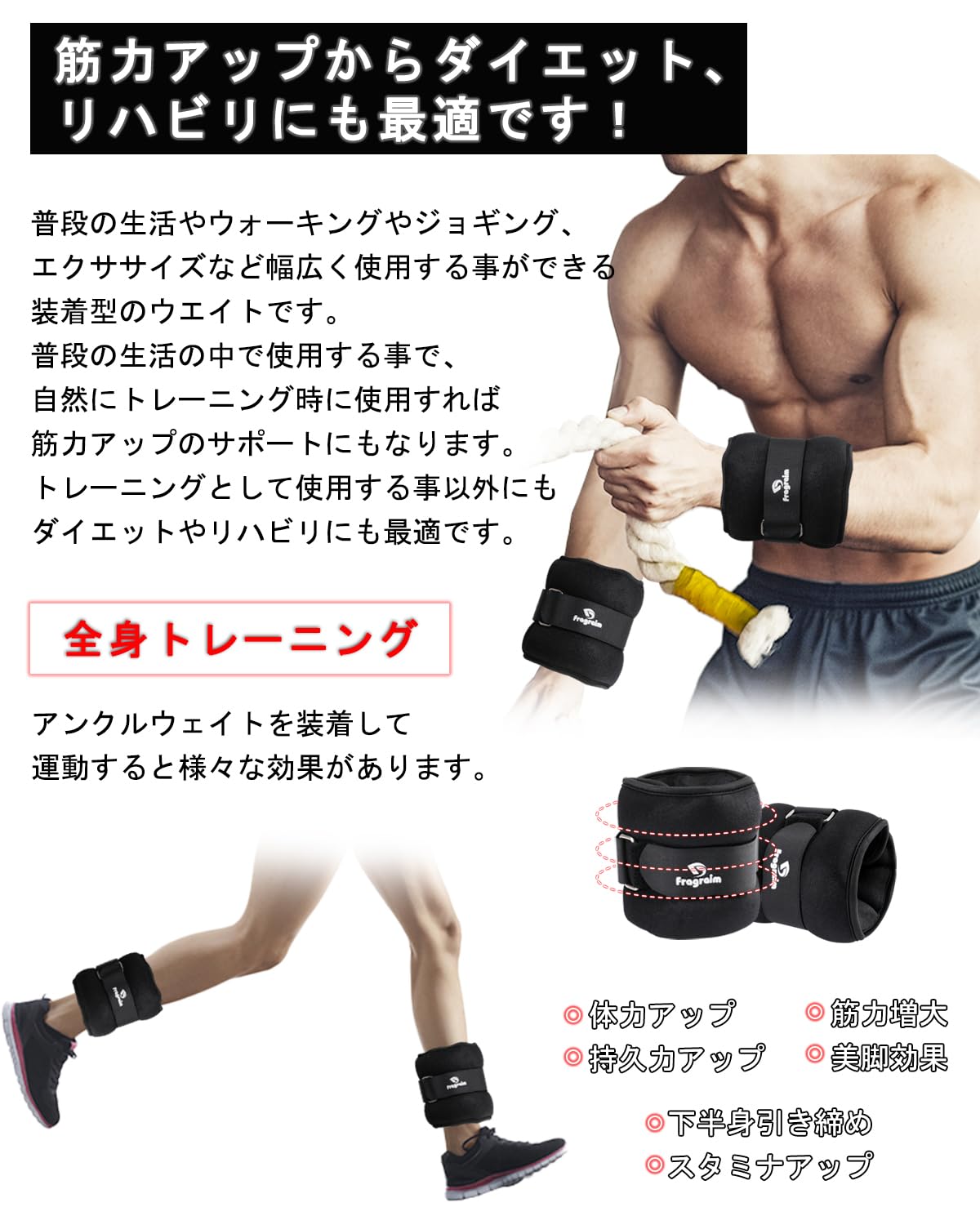 【様々な用途】ランニング、ウォーキング、ヨガ、リハビリなど様々な運動との併用により、筋トレ、足腰強化、ダイエットの効果が期待できます。いつもの動きに取り入れるだけでもトレーニング効果UPが期待できます。薄型で目立たない手足両用アンクルウエイトなので、日常の生活に馴染みやすいです。「仕事や家事が忙しくてジムに通う時間がない」「日常生活の中で少しでもトレーニングがしたい」という方にもうってつけの筋トレグッズです