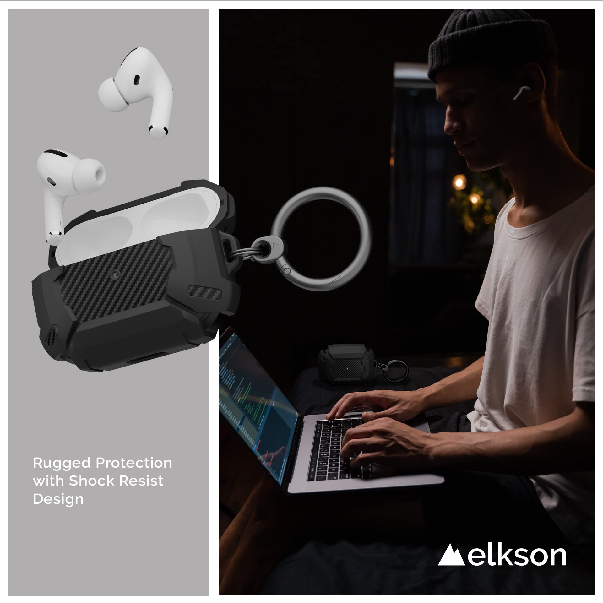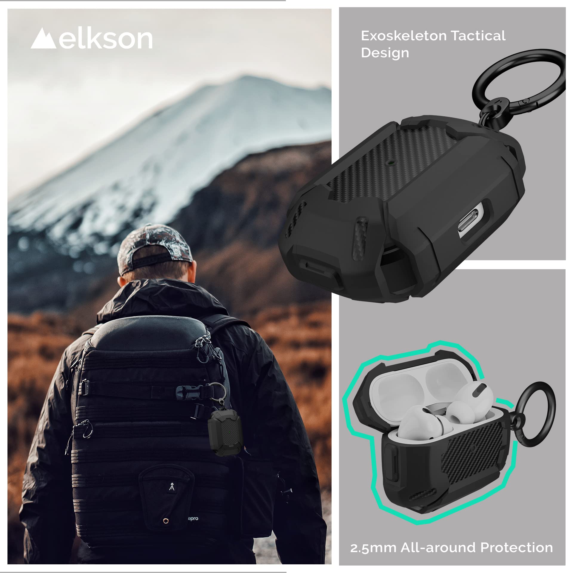 ElksonExiaシリーズミリタリーAirPodsProケースフルボディハードシェル保護カバーケーススキンAirPodProブラック用キーホルダー付き