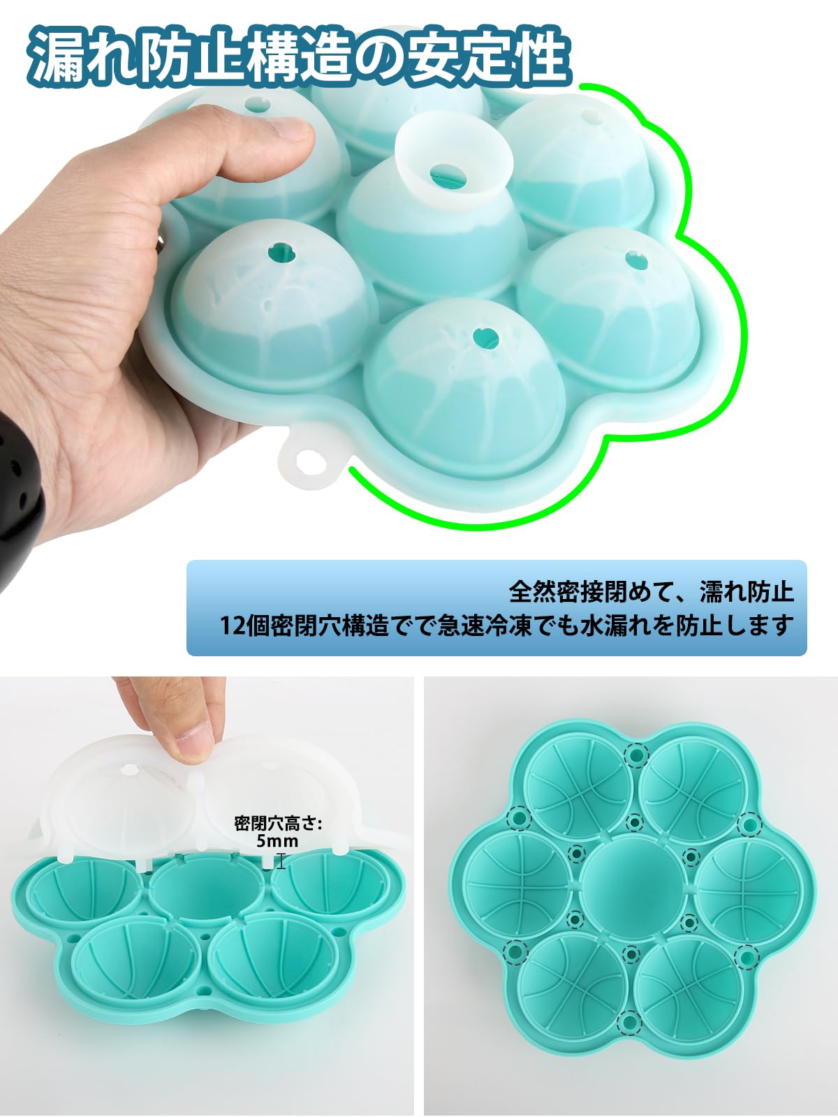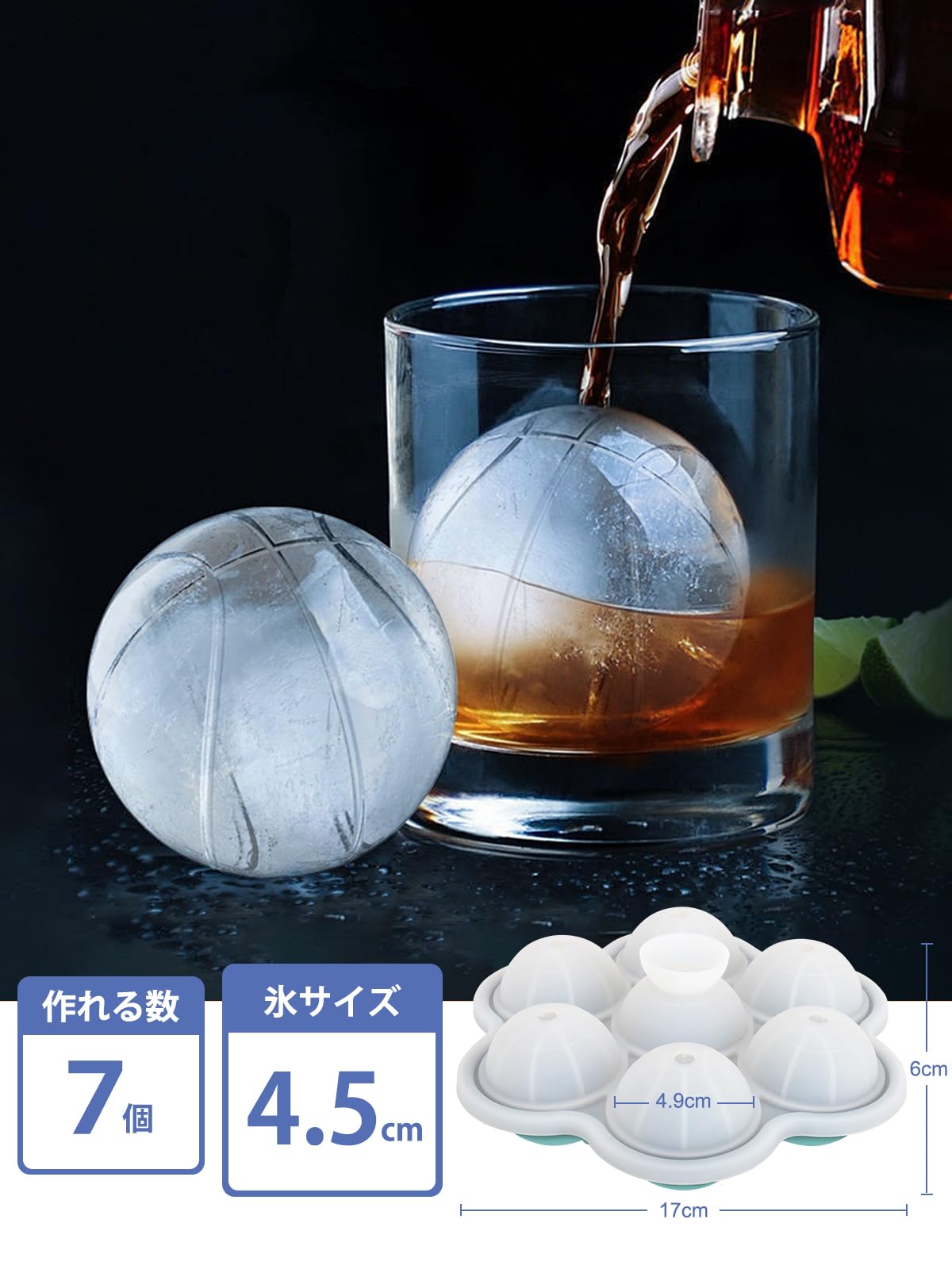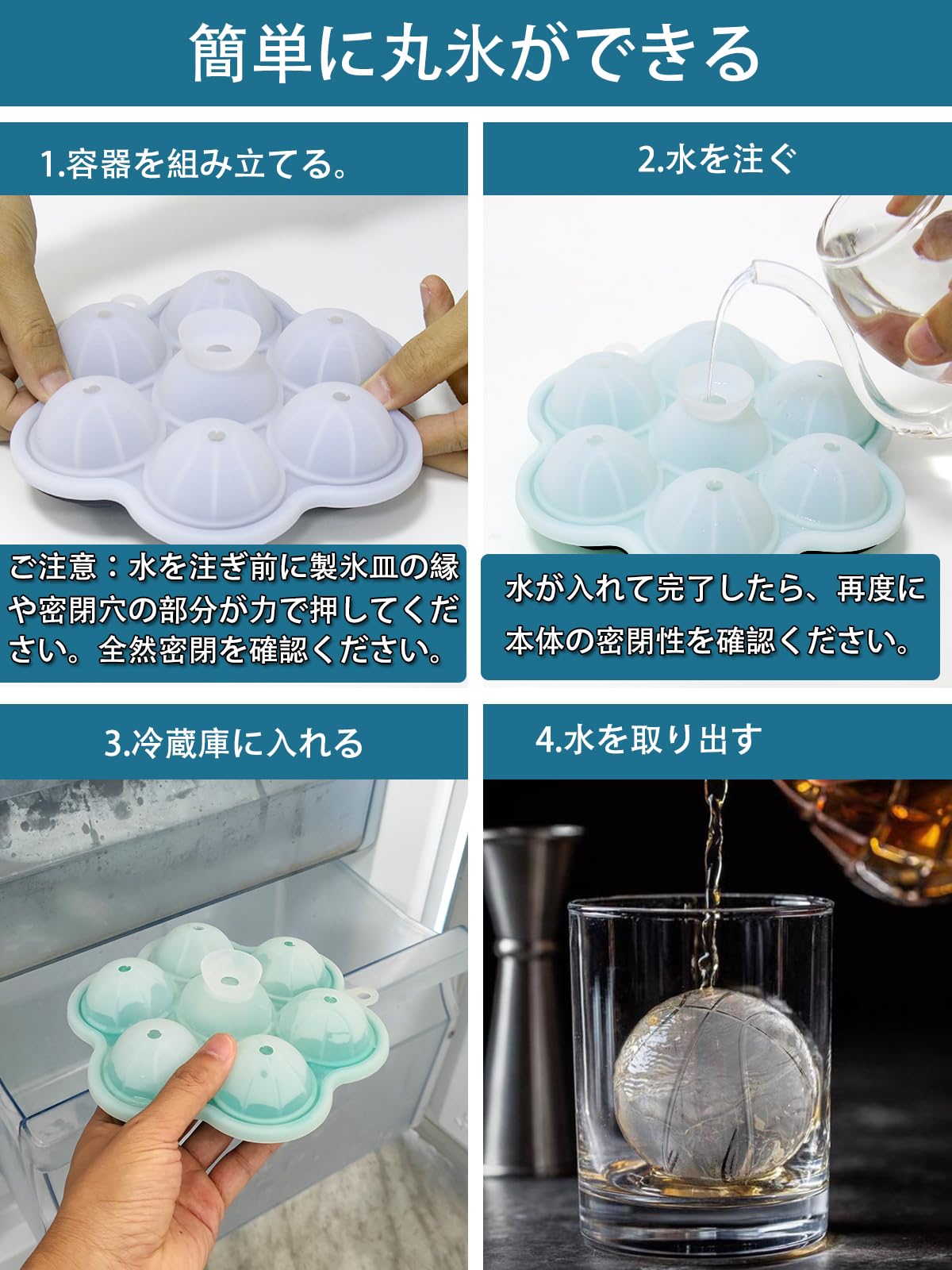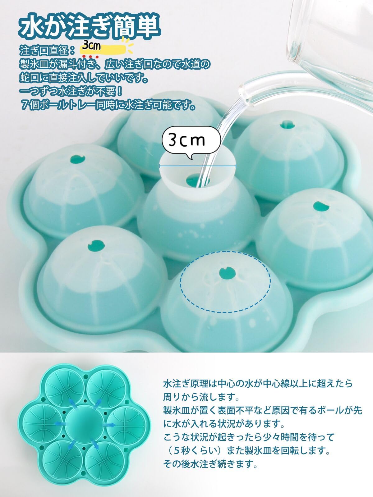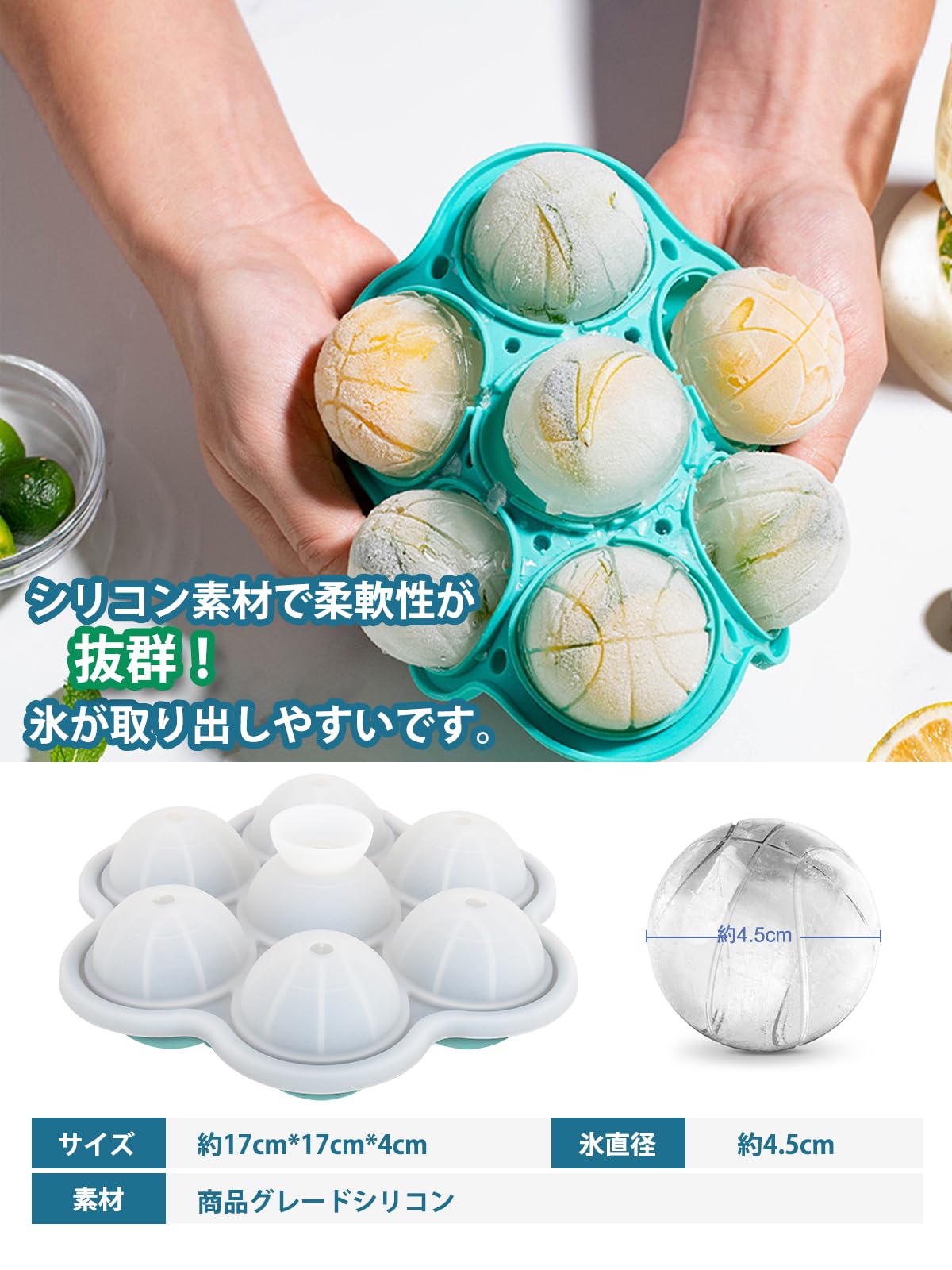 製氷皿 丸氷 製氷機 大きい氷 直径4.5cm 溶けにくい 透明氷 水漏れなし 食洗機対応 シリコーン製 取出し簡単 7枚大きめボール同時に水注ぎ 省スペース 青い