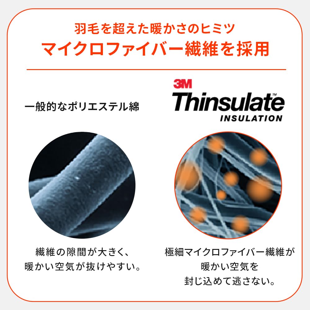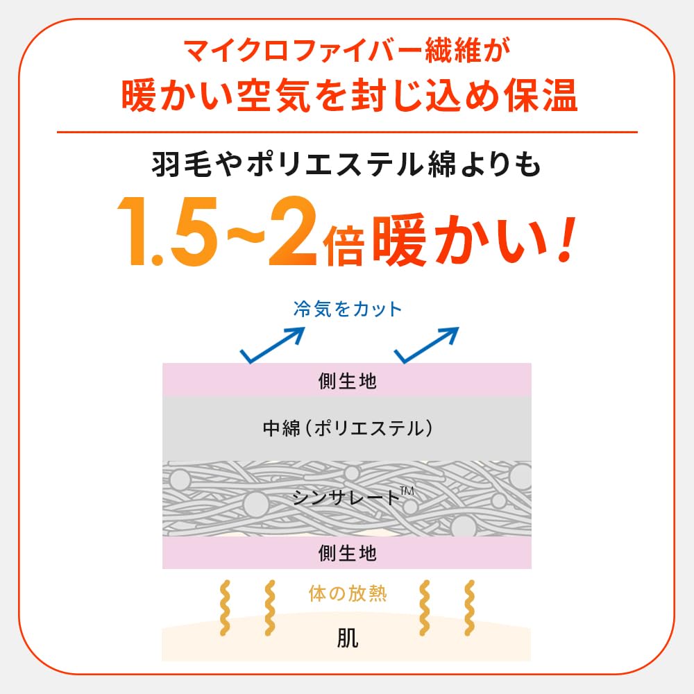 人体の熱をつかまえ逃しにくい素材で、一般的なポリエステル綿やダウンと比較すると、1.5~2倍の保温機能があります。