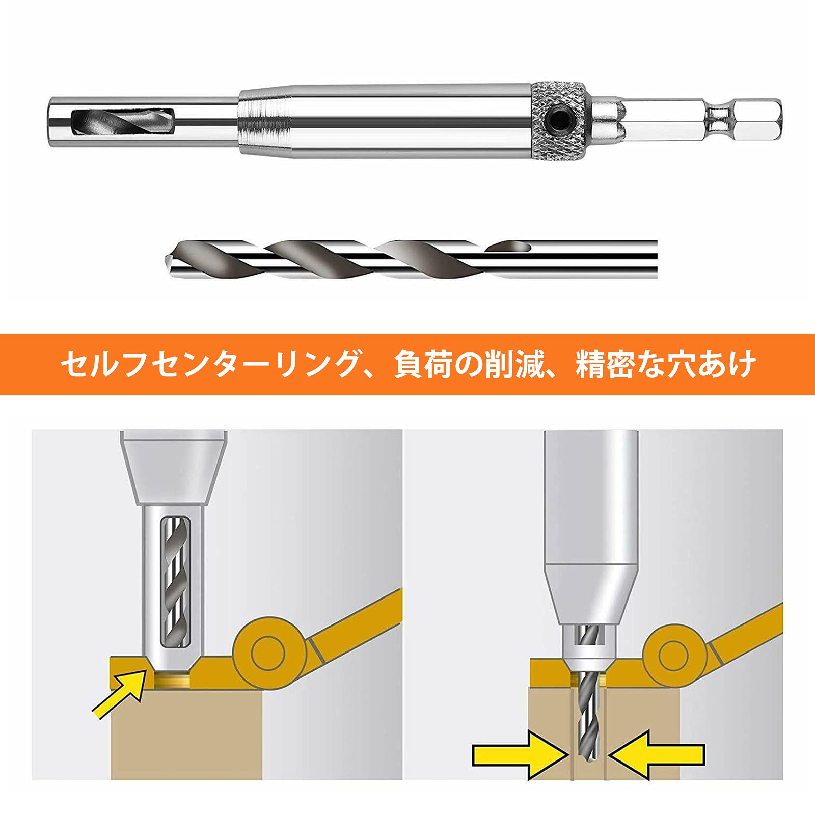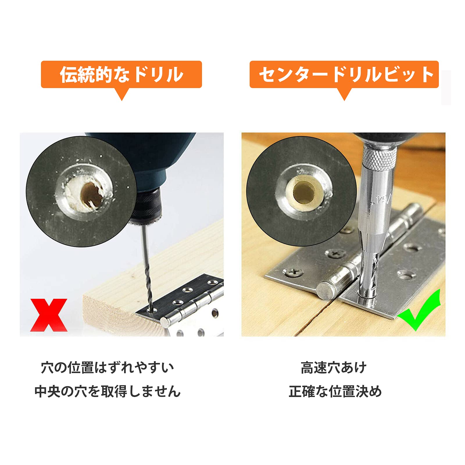 【センターに配置】:ドリルの両側に切りくず除去用の穴があります。使用時はおがくずが詰まることなく自動的に穴から排出されるため、穴あけの精度が向上します。ドリルビットは自動的に中央位置に配置されて、ビットシフトの心配はありません。