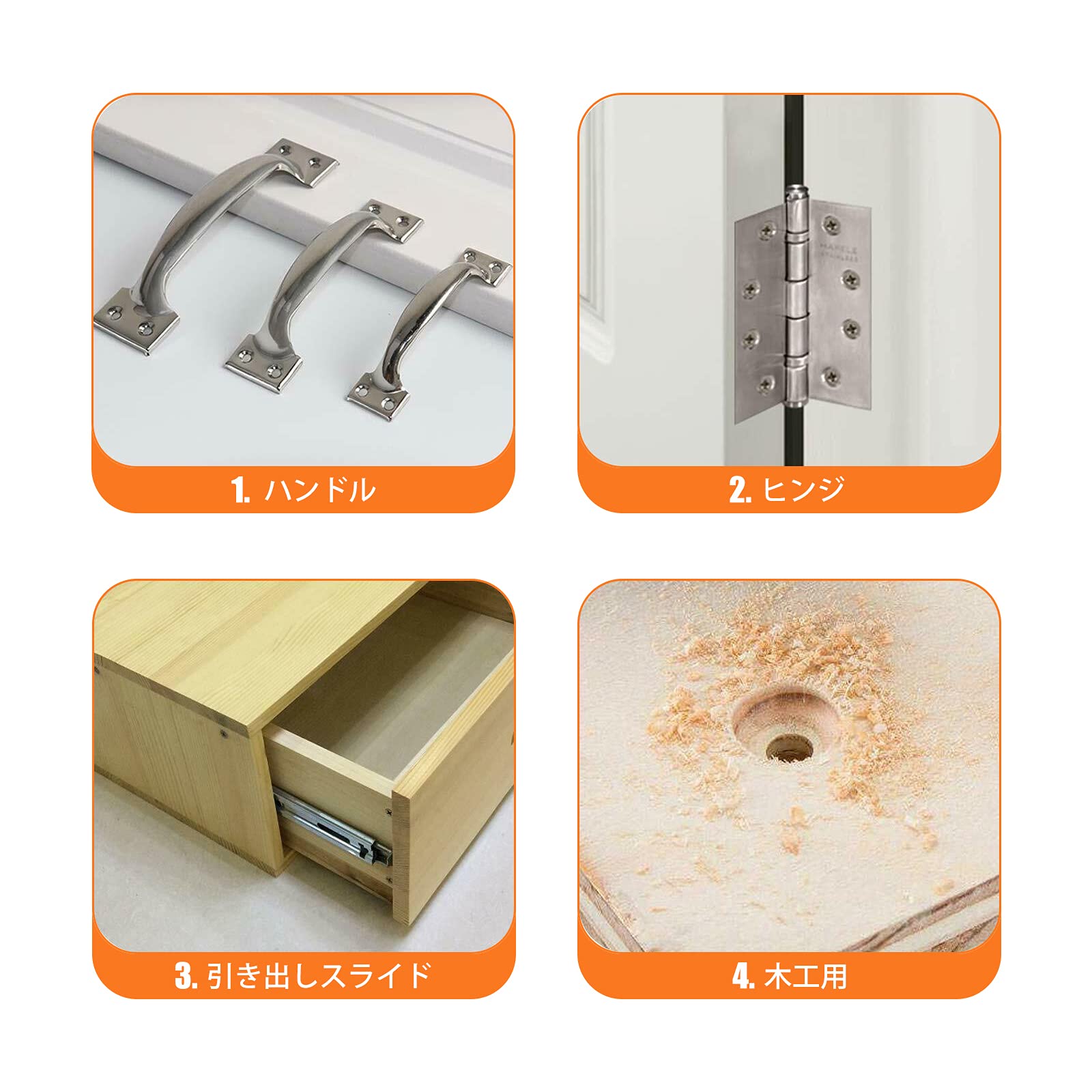 【適用範囲】:ドアや窓、キャビネット、ヒンジ、引き出しスライド、その他の家具製造などの木工プロジェクトで広く使用されています 。