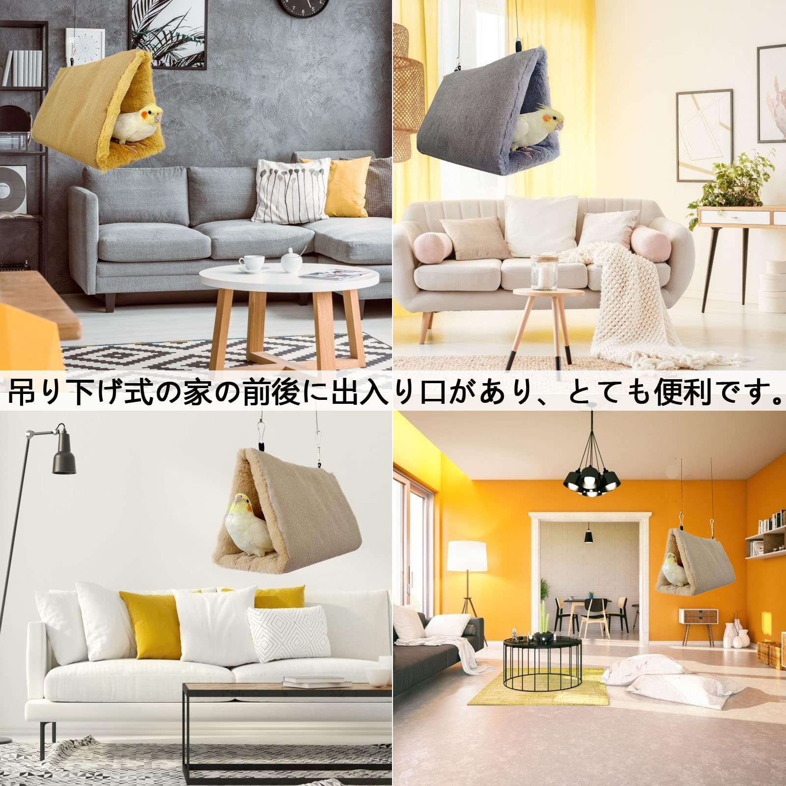 【片側開放型と両側開放型】かわいい無地模様のハンモック。片側を開き、両側を開く、2種類からお選びいただけます。三角ハウス、ペット用テント、入り口の直径が大きいので、羽を広げても鳥が巣に出入りしやすく、入り口が狭くて入れないという問題を解決してくれます。あなたの小動物は眠ったり、その中に隠れたりしたいと思うでしょう。
