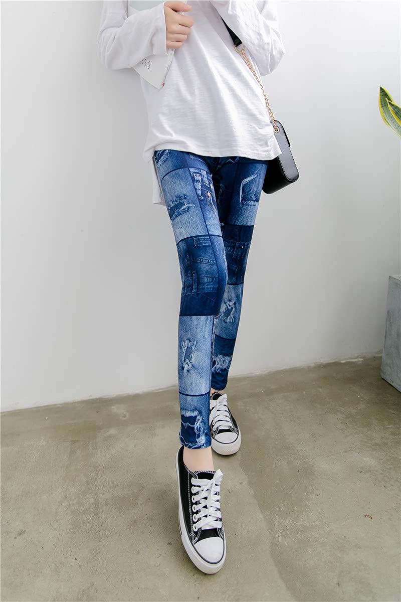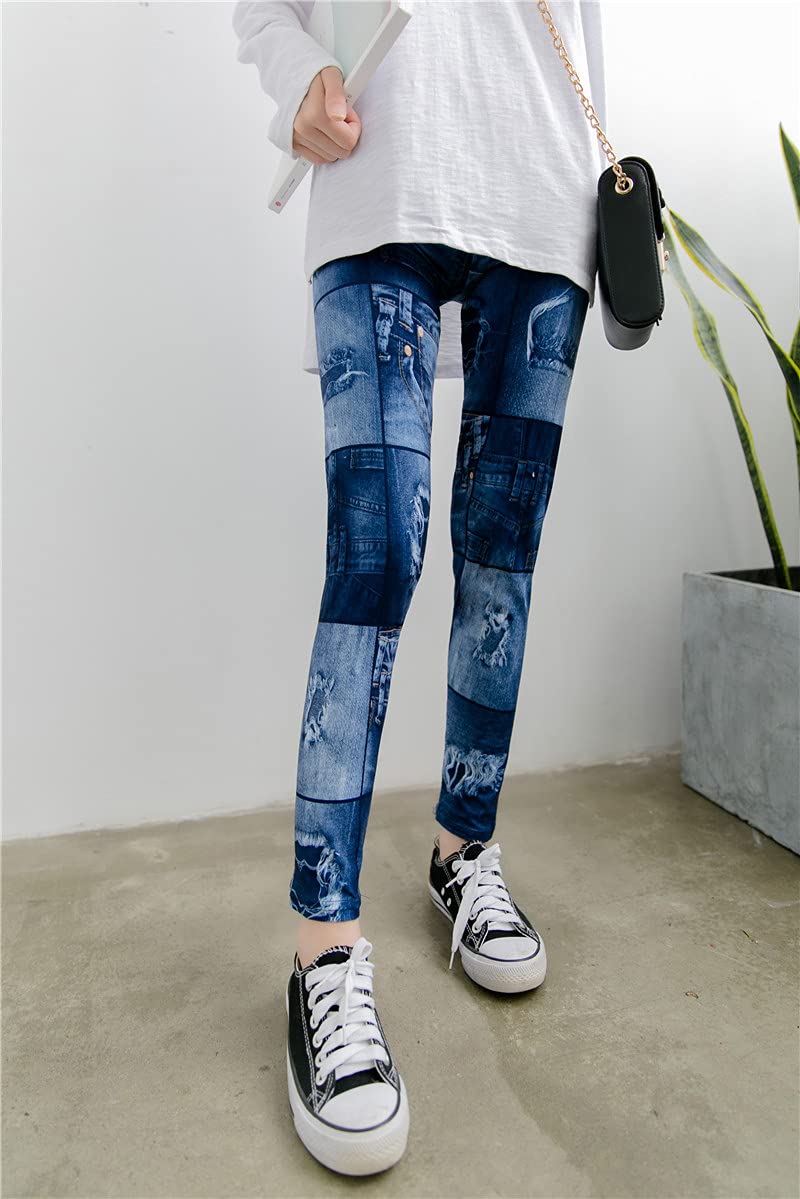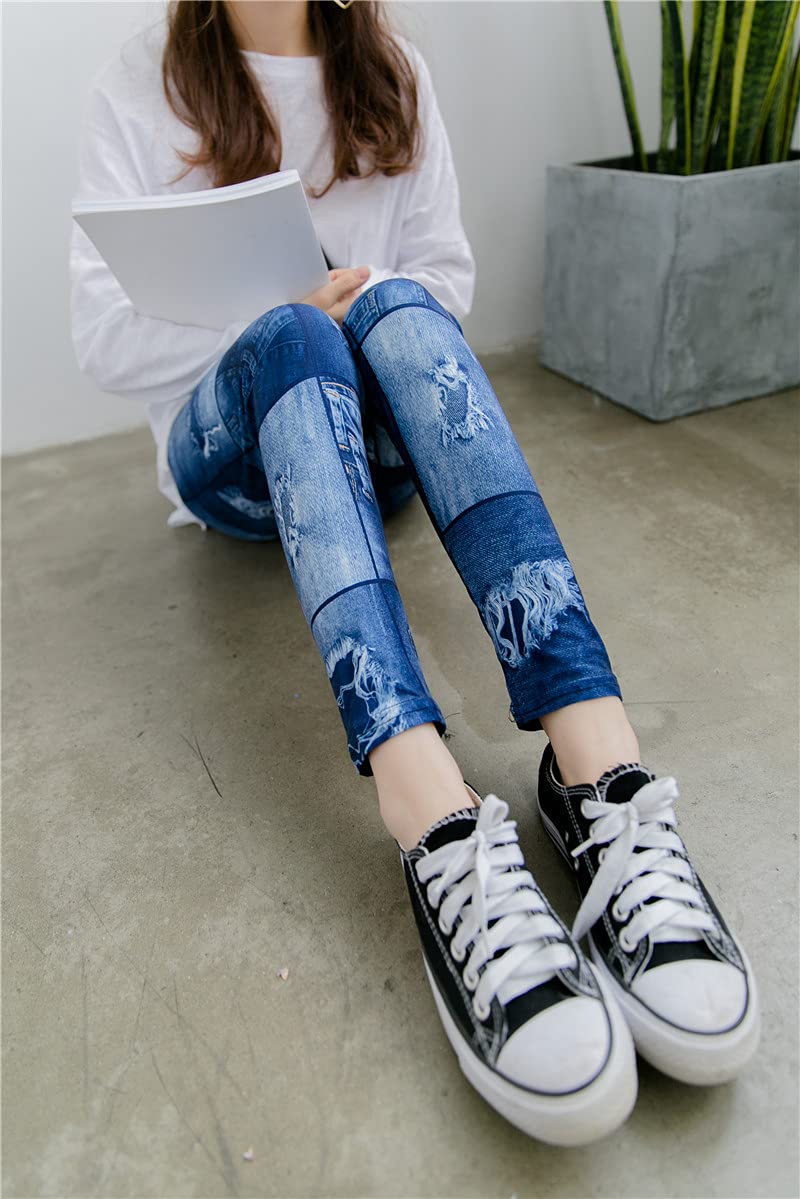 [Uroi] デニム風 レギンス レディース 美脚 パンツ スパッツ レギパン スキニー ストレッチ ウォッシュ感 ダメージ加工 ウエストゴム