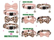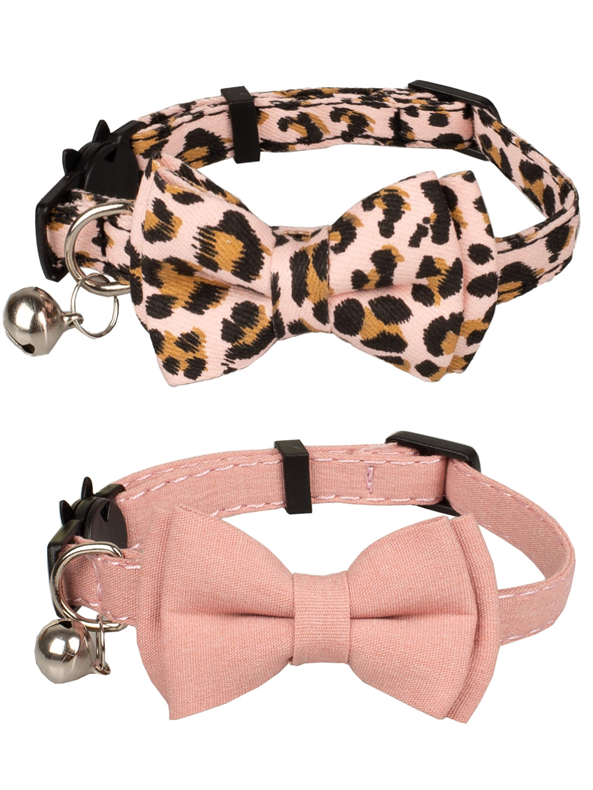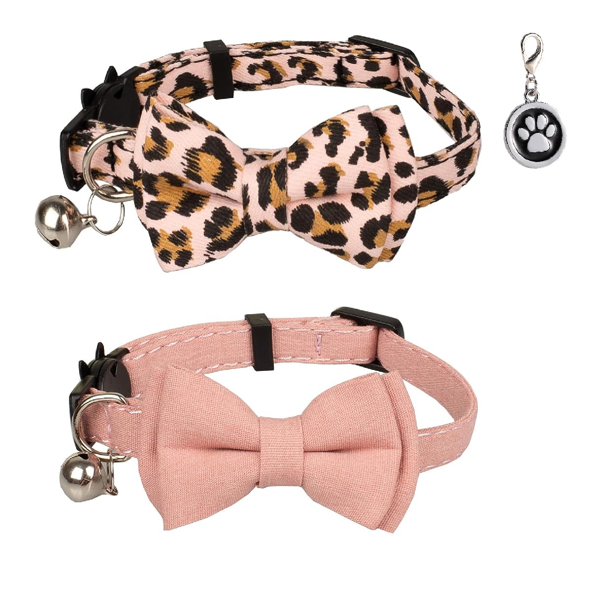 PIANETA 猫 首輪 ネコ 猫用 首輪 子犬 迷子札付き リボン付き 鈴付き セーフティバックル 可愛い 調整可能 軽量 ペット首輪 2個セット (豹柄+ピンク)