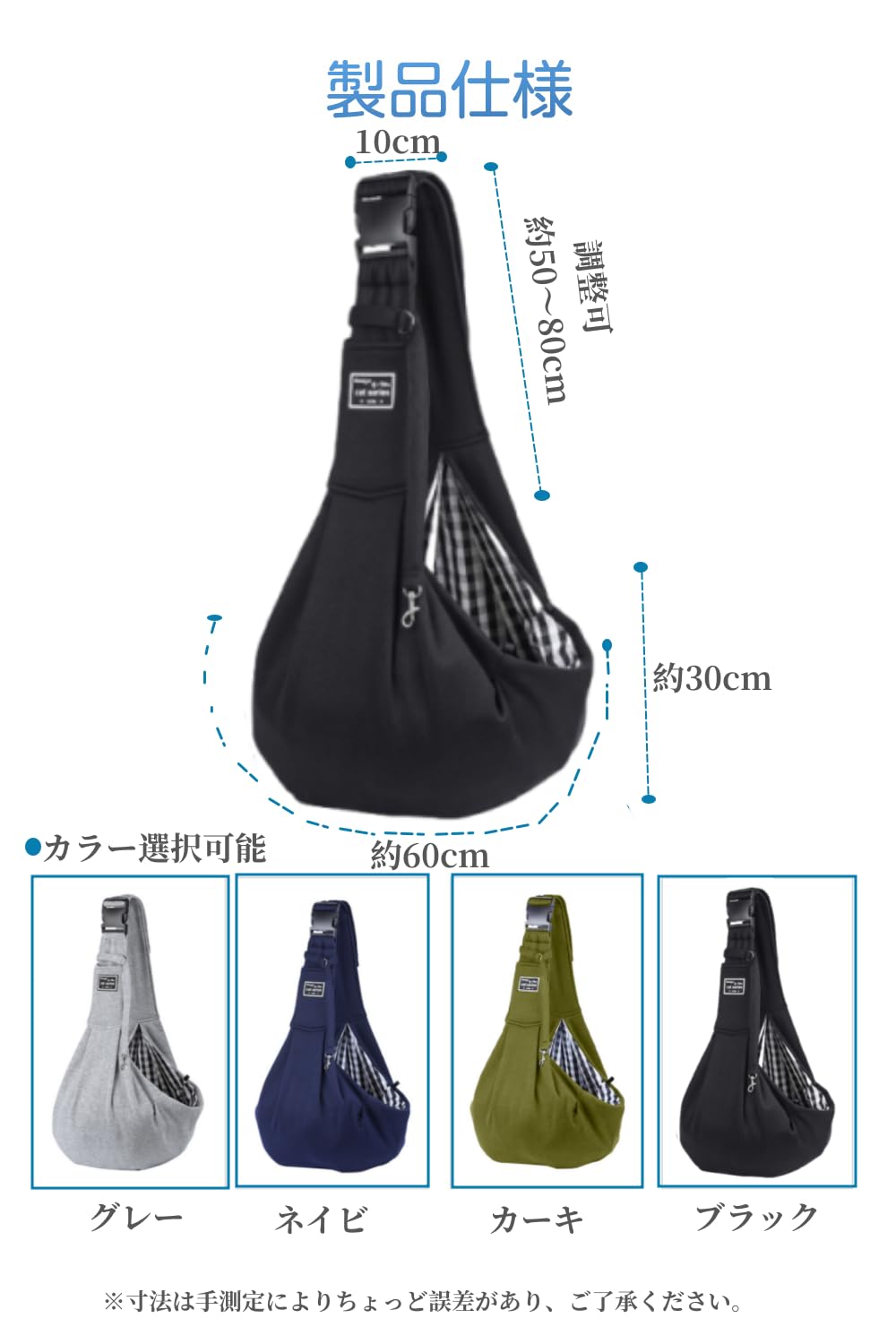 【製品仕様】スリングバッグ、展開サイズ:50cm×45cm×75cm、肩幅約12cm。カラー:グレー、ブラック、ネイビ3色選択可能。