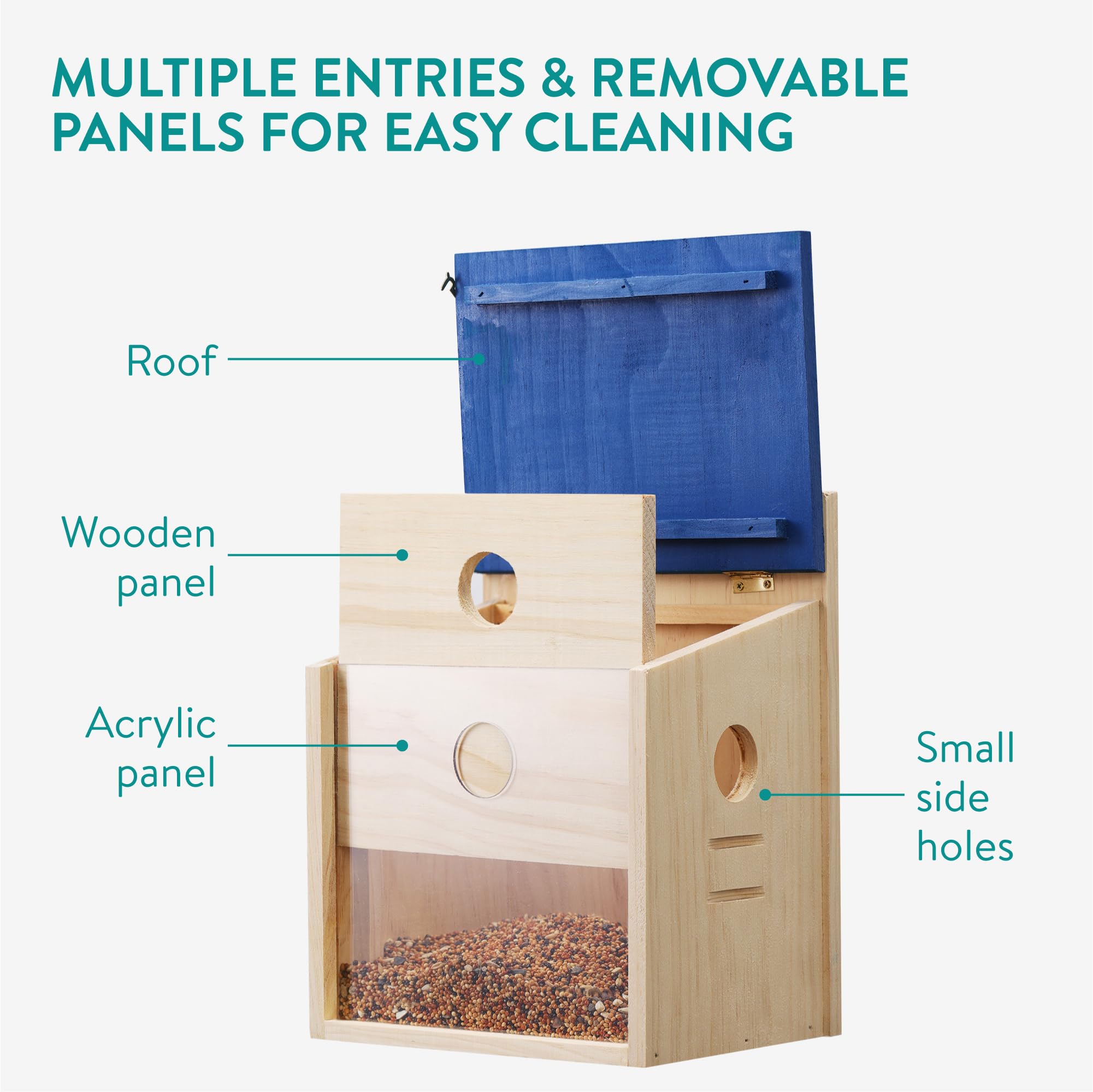 木製バードハウス: 寒さや雨など、あらゆる天候から鳥を守る巣箱で、お庭に鳥たちのお気に入りの場所を作ることができます。開閉可能な屋根部分で、鳥の餌を交換したり、巣箱内のお掃除を気軽に行うことができます。前面はセットに含まれる木製ウォール、透明ウォールの2つに交換することができ、鳥たちの観察など、使用用途によって使い分けが可能です。