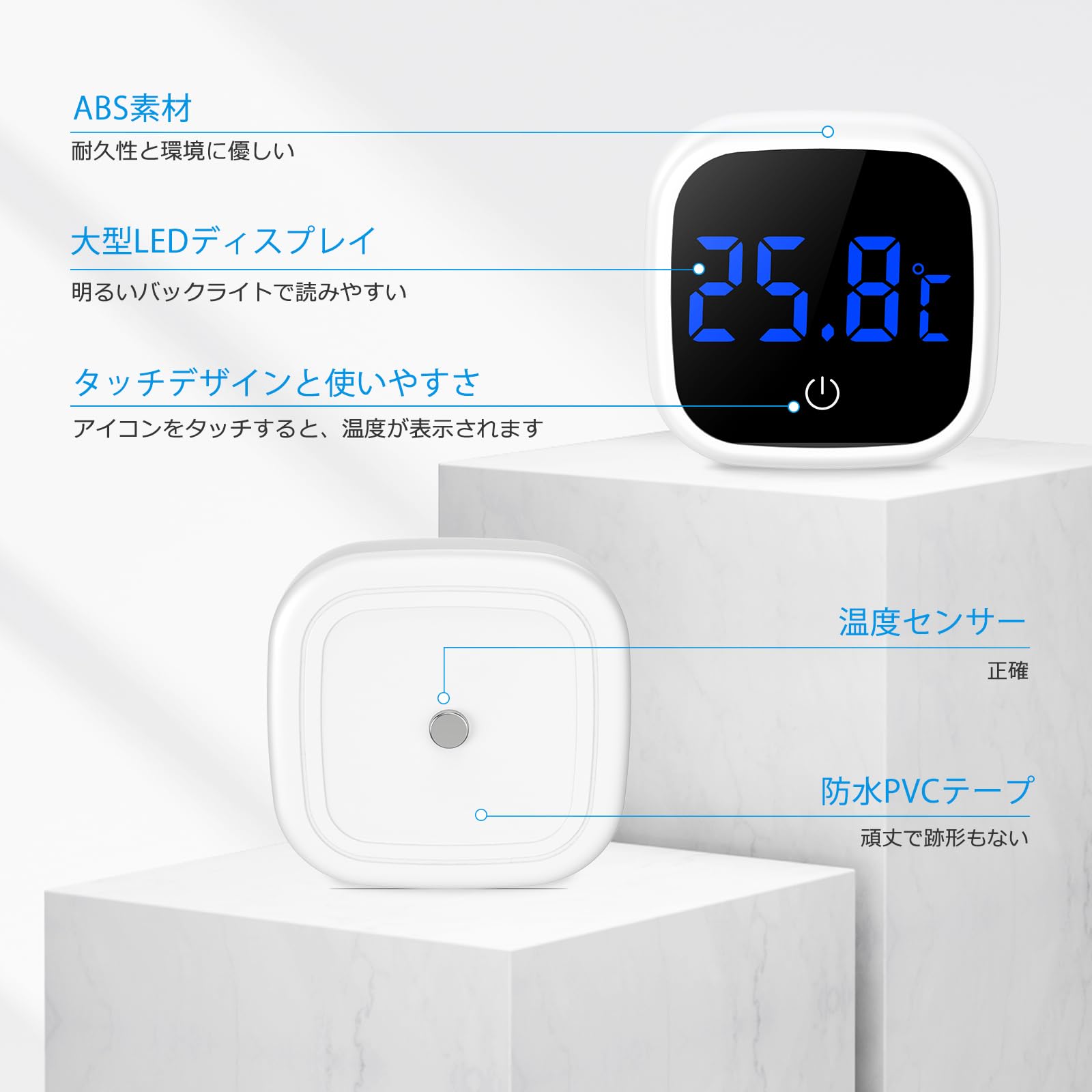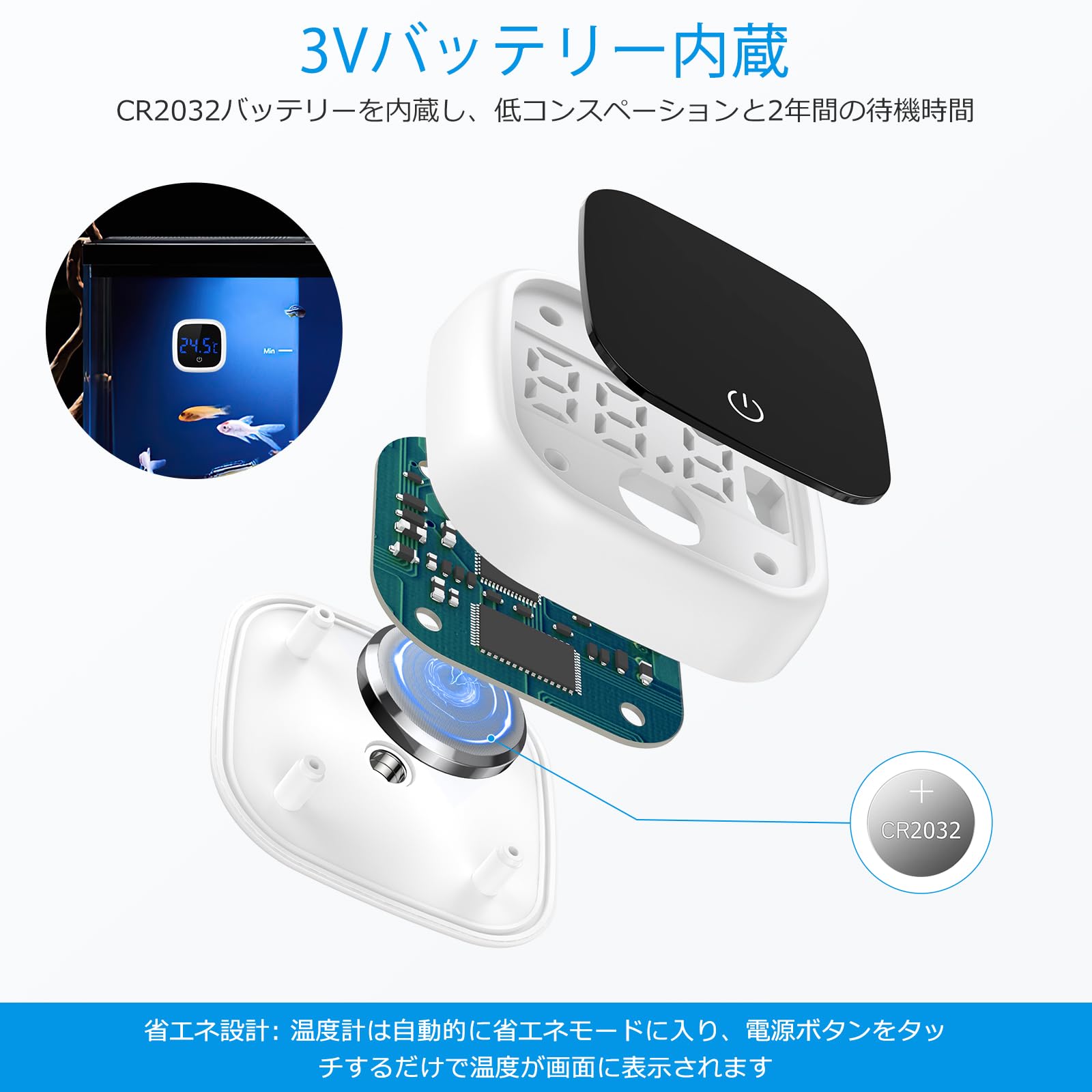 【タッチボタンの表示温度】タッチボタンの表示温度は、温度計が自動的にスリープ状態に入った後、操作なし5秒、より環境に優しい省エネ、内蔵のCR2032ボタン電池は、24ヶ月間使用することができます。