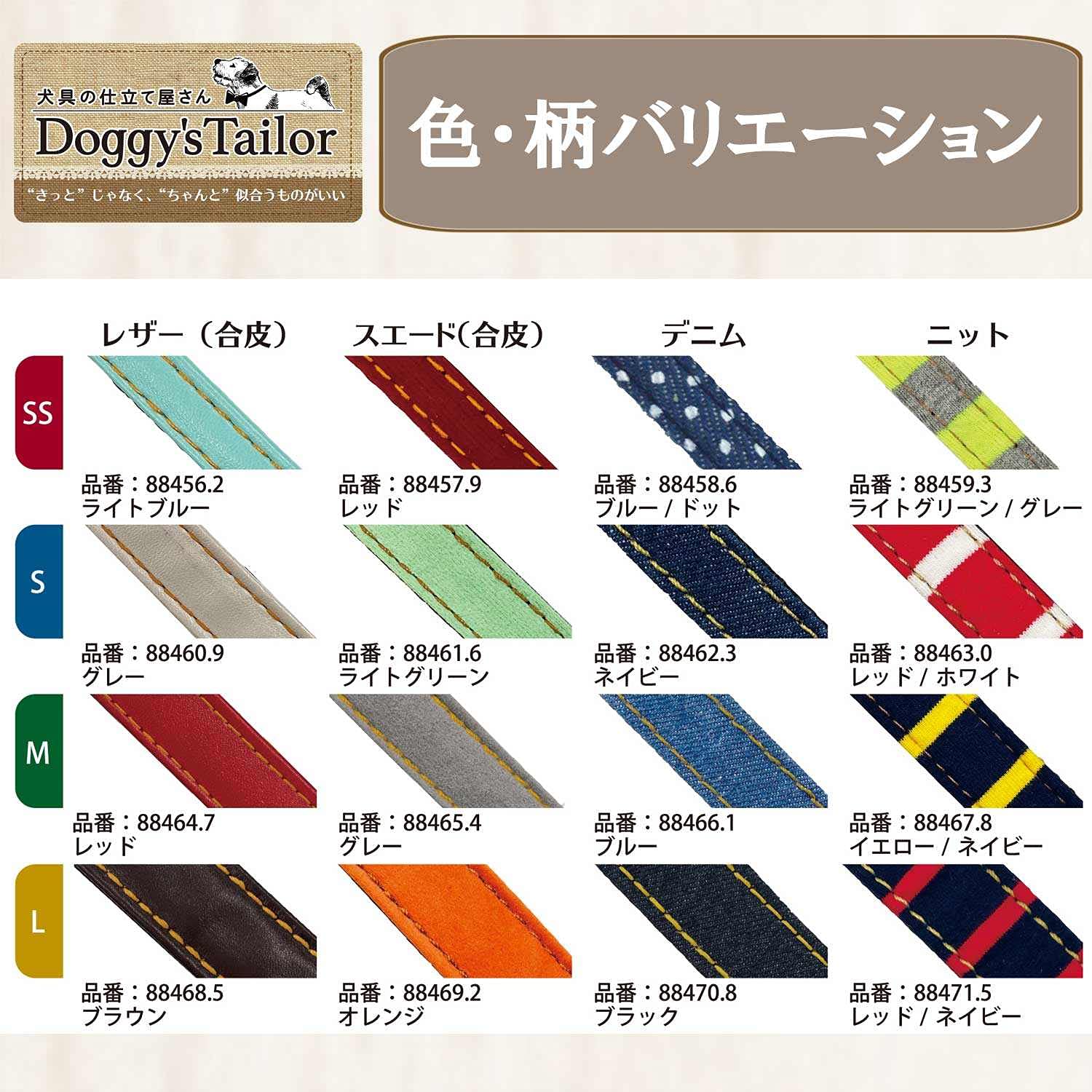 飼い主さんが愛犬のための仕立て屋さんになり、ぴったり似合うお散歩コーデを探せる犬具のシリーズです。愛犬の毛の色や対象サイズに合わせた色柄だけでなく、表生地素材にもこだわってお選び頂けます。ちょっとしたオーダーメイドのような感覚で楽しめるバリエーション展開です。裏側ナイロンテープの2重構造の頑丈な縫製で、胸当ては柔らかいクッション生地を採用。使いやすいワンタッチバックル仕様の胴輪です。