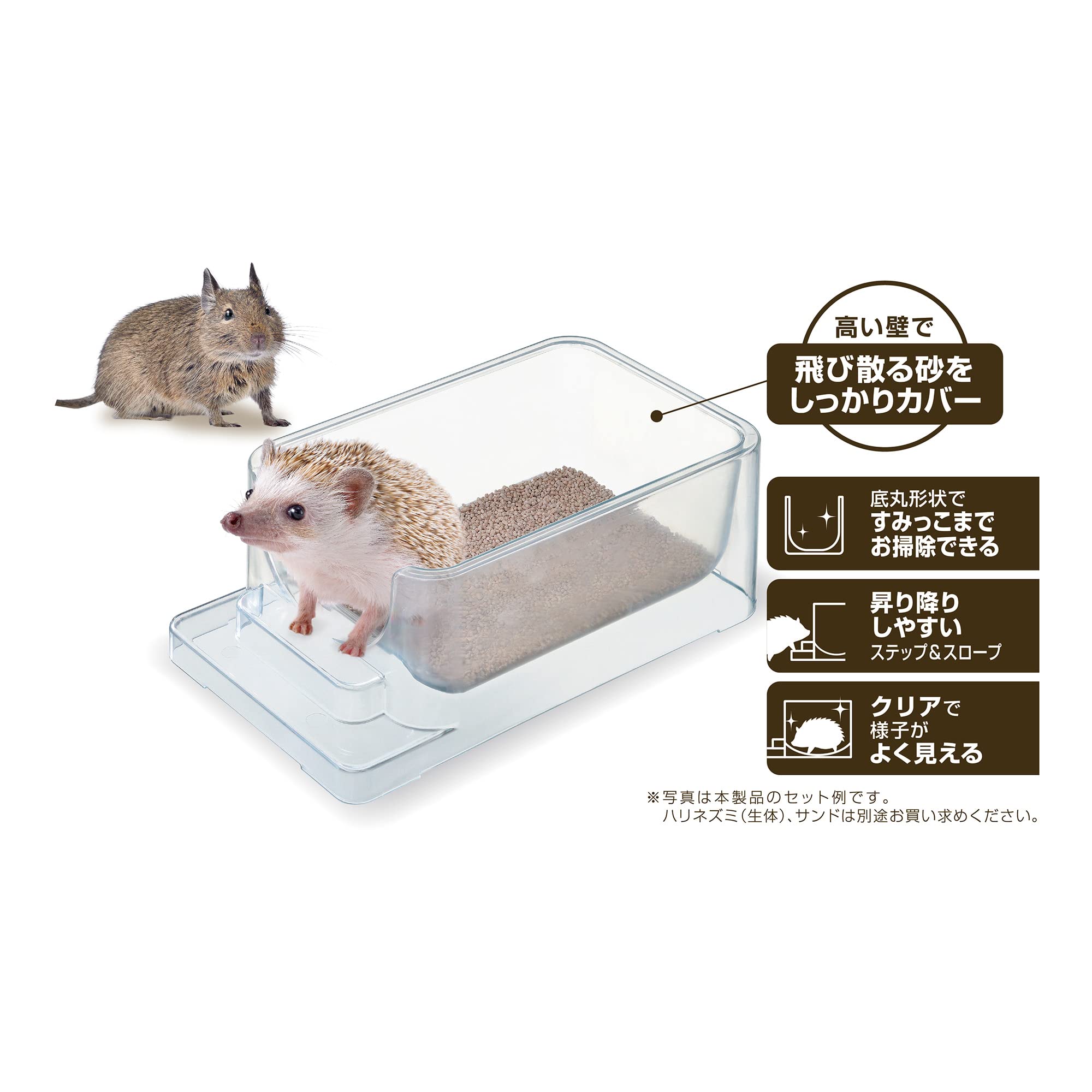 ●ハリネズミ用サンド(別売)を1-2cmの厚さを目途に入れてください。 ●汚れが目立ってきたら、新しいサンドに交換してください。 ●本製品が汚れたら、柔らかい布やスポンジを用いて、水またはぬるま湯でよく洗ってください。