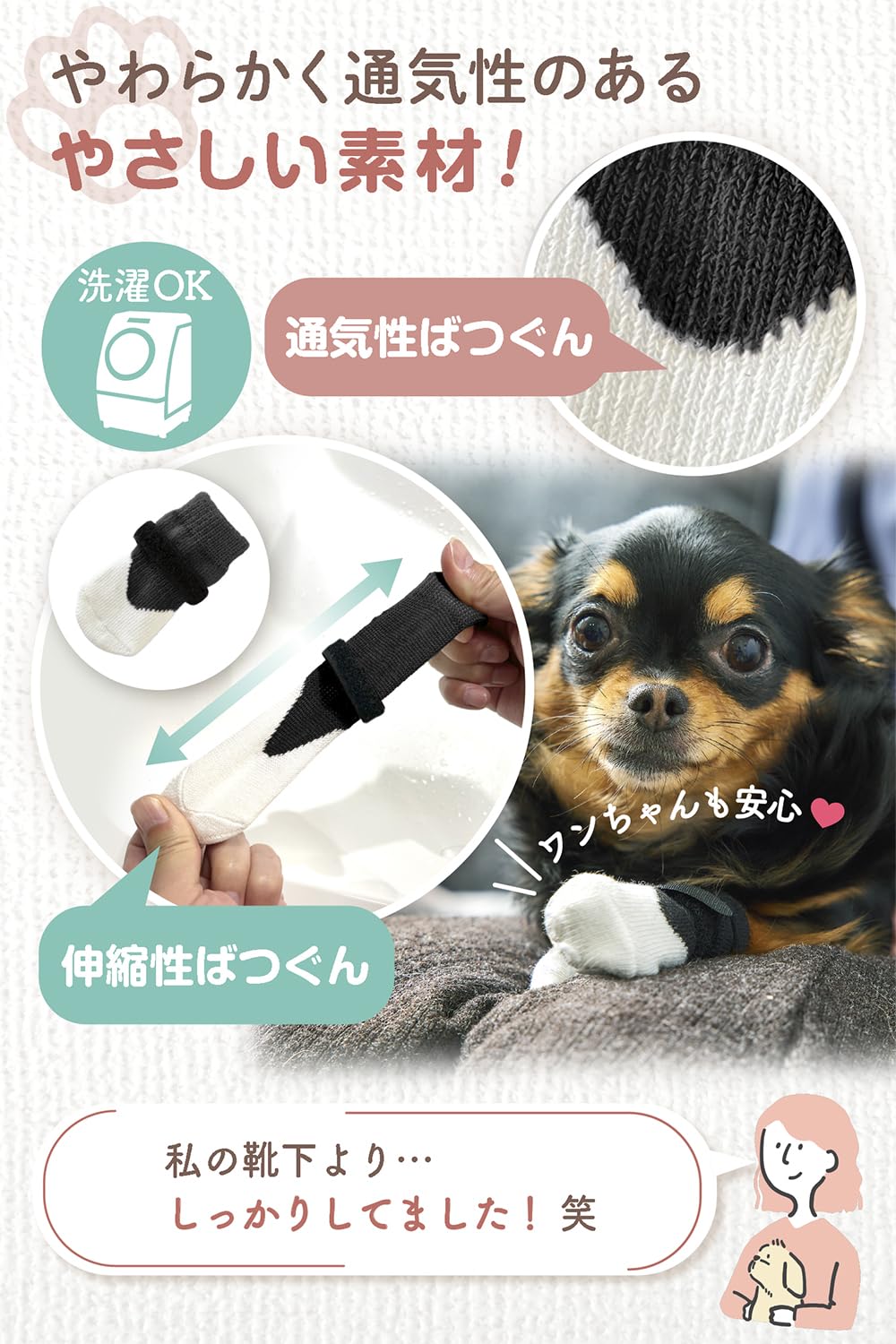 ? 伸縮性と通気性 : 上質なコットンを使用し伸縮性はばつぐん。また、滑り止めもドット模様にすることで通気性を確保しております。犬は肉球から汗をかくので、愛犬のことを思うなら通気性はとても重要です。