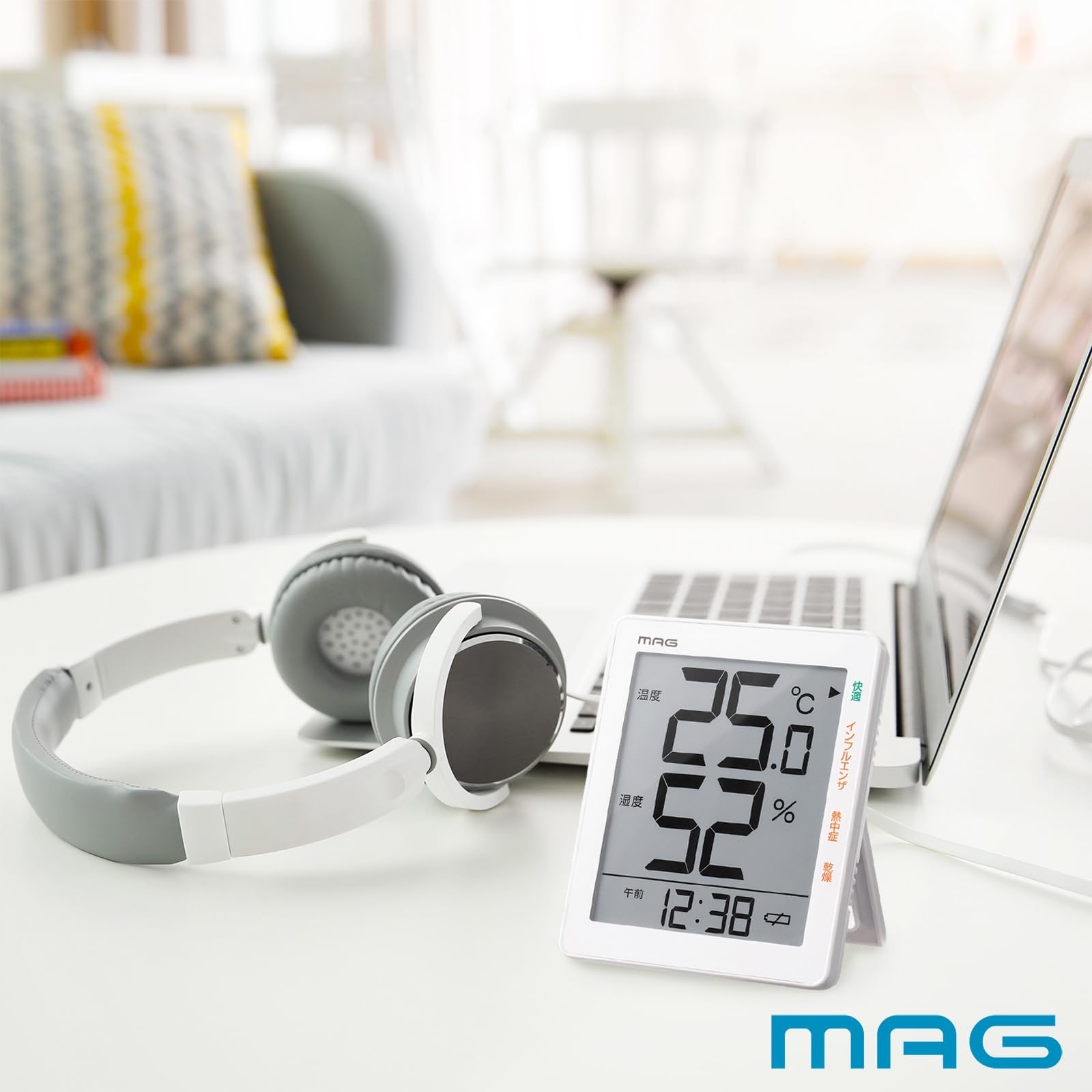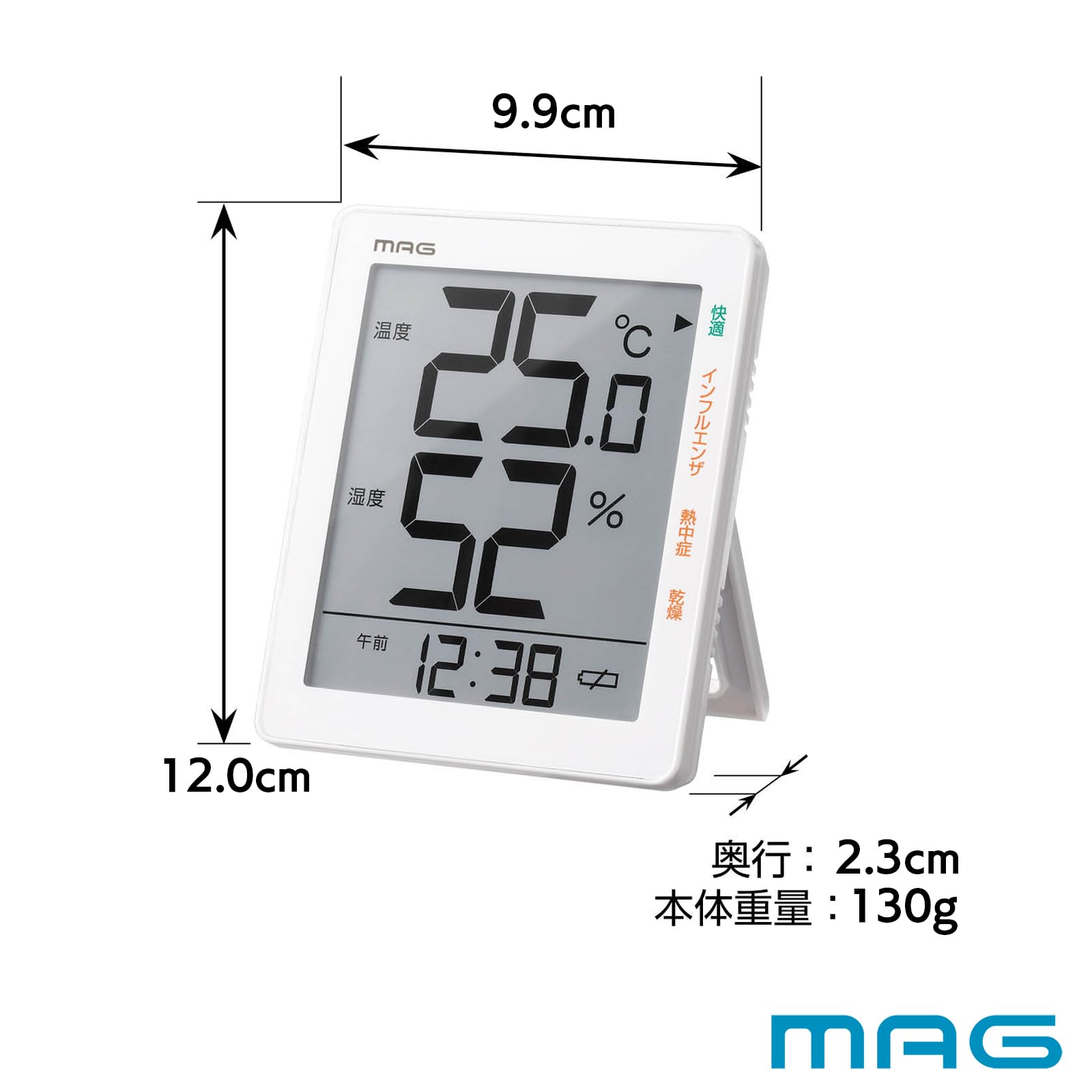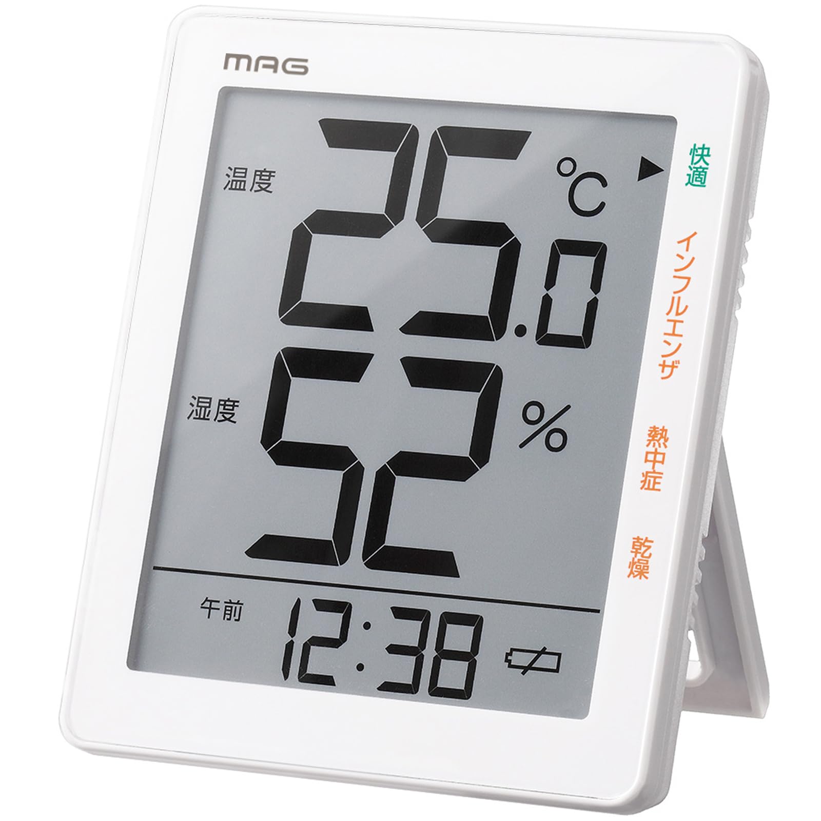 【数量限】MAG(マグ) 温度計 湿度計 温度湿度計 デジタル 環境目安表示 熱中症 インフルエンザ 乾燥 快適 時計表示 大型 大きい 置き掛け兼用 ホワイト TH-105 WH ノア精密 | GIGATERA