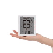 ●大きな文字で温度と湿度をデジタル表示する温湿度計。温度と湿度のバランスからお部屋の環境目安を表示してくれる機能付き