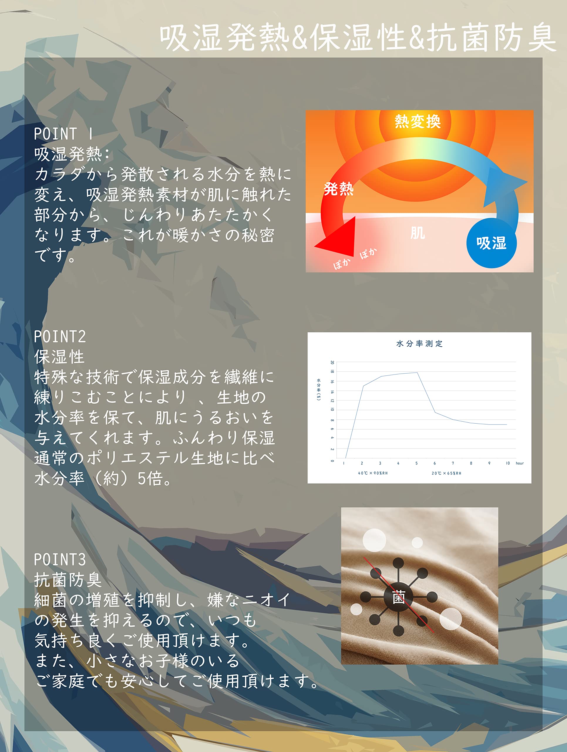 【吸湿発熱加工】:吸湿発熱素材を使用し、身体から出る湿度を利用して熱に変換、自ら暖かくなり、暖かさを実感できます。【保湿機能加工】:特殊な技術で保湿成分を繊維に練りこむことにより 、生地の水分率を保て、肌にうるおいを与えてくれます。ふんわり保湿、通常のポリエステル生地に比べ水分率(約)5倍。【抗菌 ・ 防臭加工】:細菌の増殖を抑制し、嫌なニオイの発生を抑えるので、いつもでも気持ち良くご使用頂けます。また、小さなお子様のいるご家庭でも安心してご使用頂けます。