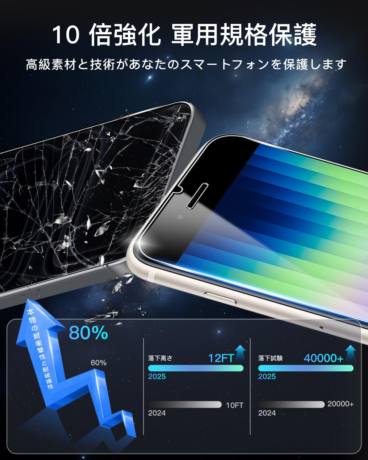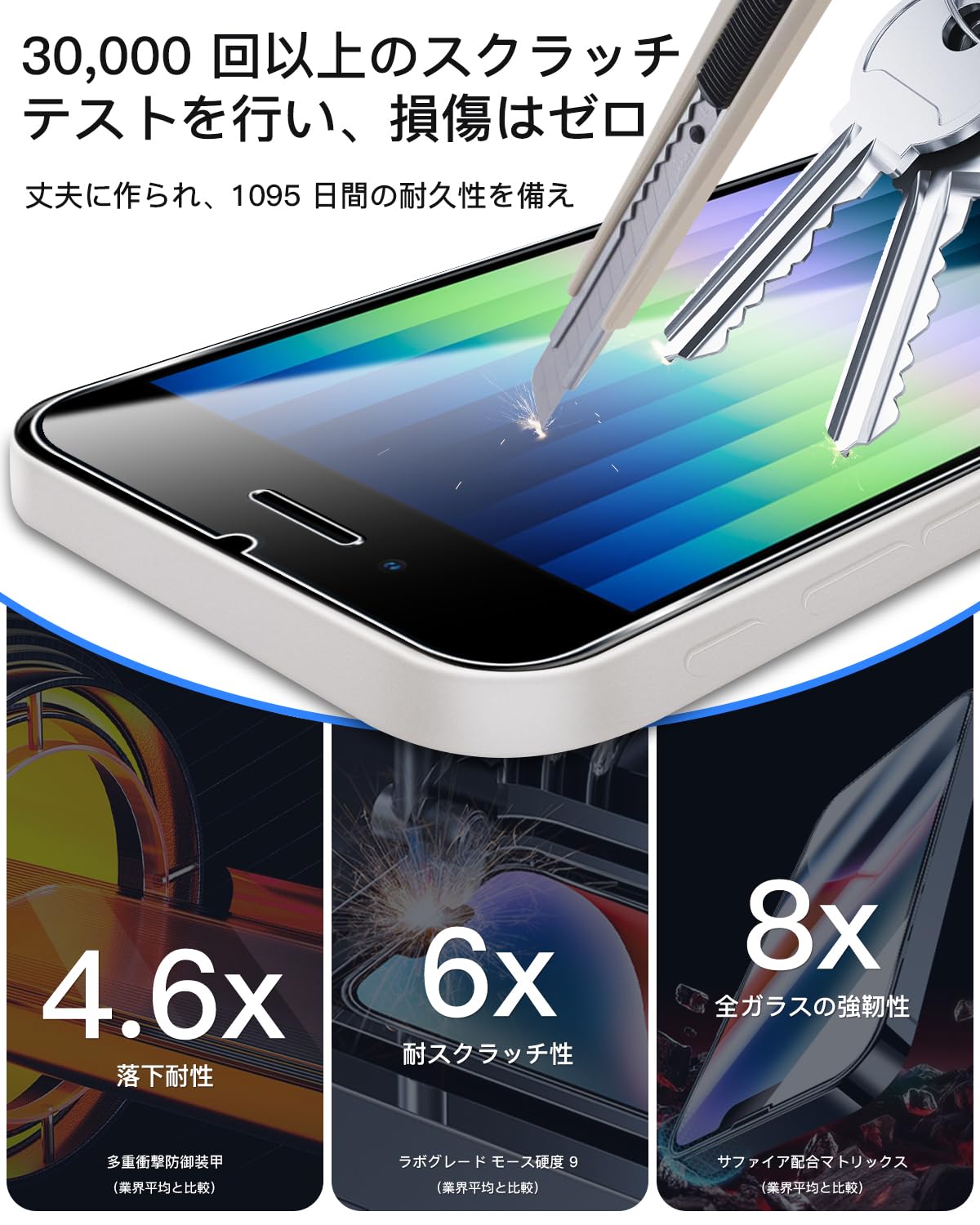【?9H硬度?全面保護?飛散防止】 用 アイフォンSE3 / SE2 / 8 / 7 / 6 / 6s 強化ガラスフィルムはオールガラスナノ防爆フィルムで、二次強化を使用して、硬度は9Hダイヤモンドレベルに達し、壊れることはありません。真空電気めっきプロセスを採用し、2.5Dラウンドエッジ仕様。また、 用 iPhone SE3 / SE2 / 8 / 7 / 6 / 6s 強化ガラスフィルムには飛散防止加工が施され、落としたりぶつかって万が一割れてしまった際にも安心です。
