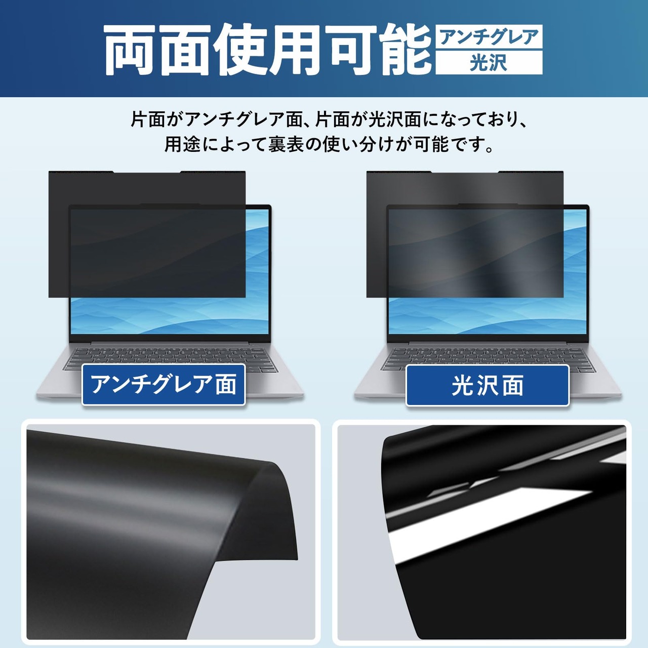 【両面使用可能】 表面は反射防止(アンチグレア)コーティングを施しているので反射やギラつきを抑えます。もう片面はクリアに視認出来る光沢クリアコーティングを施しており、好みの面を選んで使用できます。