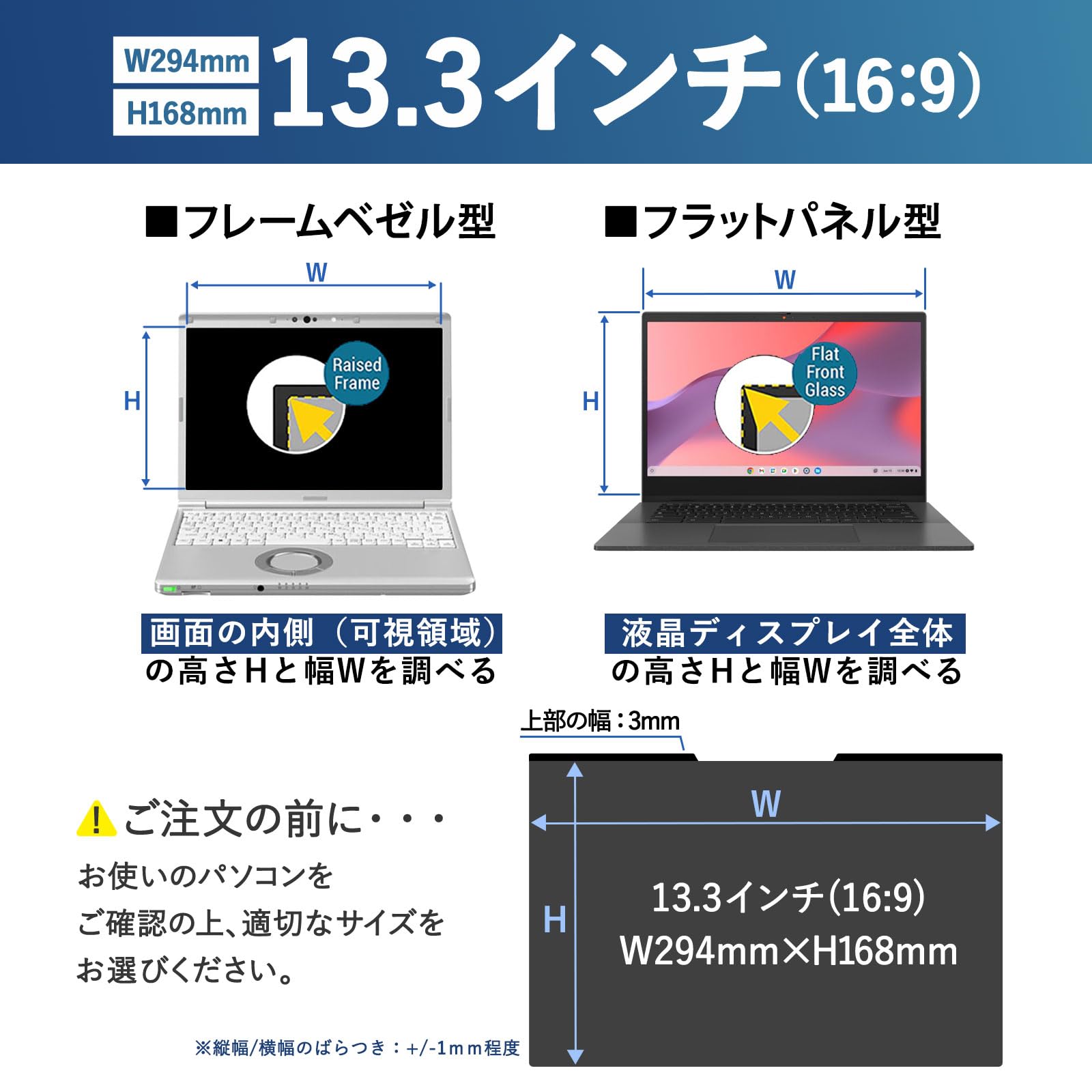 【対応機種】 13.3インチ 縦横比 16:9 寸法:フィルター部分のみ W294mm x H168mm (縦幅/横幅のばらつき:+/-1mm程度)。上部の黒いマグネット部分は約3mmなのでフレーム枠が細い機種にも対応しています。画面とベゼルの高低差により画面がややぼやけて見える場合がございます。
