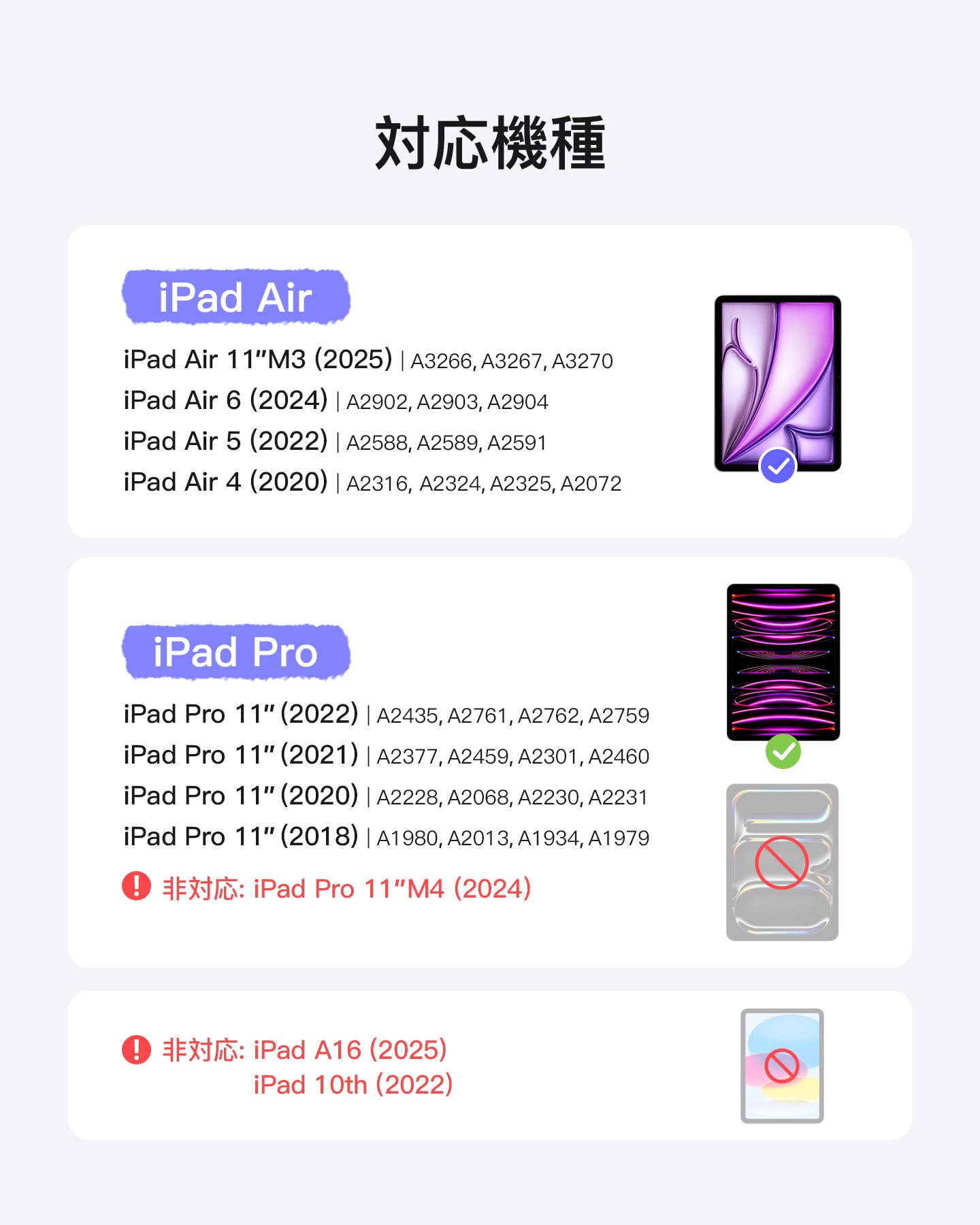 対応機種:iPad Air 11インチ M3 2025/M2 2024、iPad Air 第5世代/第4世代 10.9インチ、およびiPad Pro 第4世代/第3世代/第2世代/第1世代 11インチ専用に設計されています