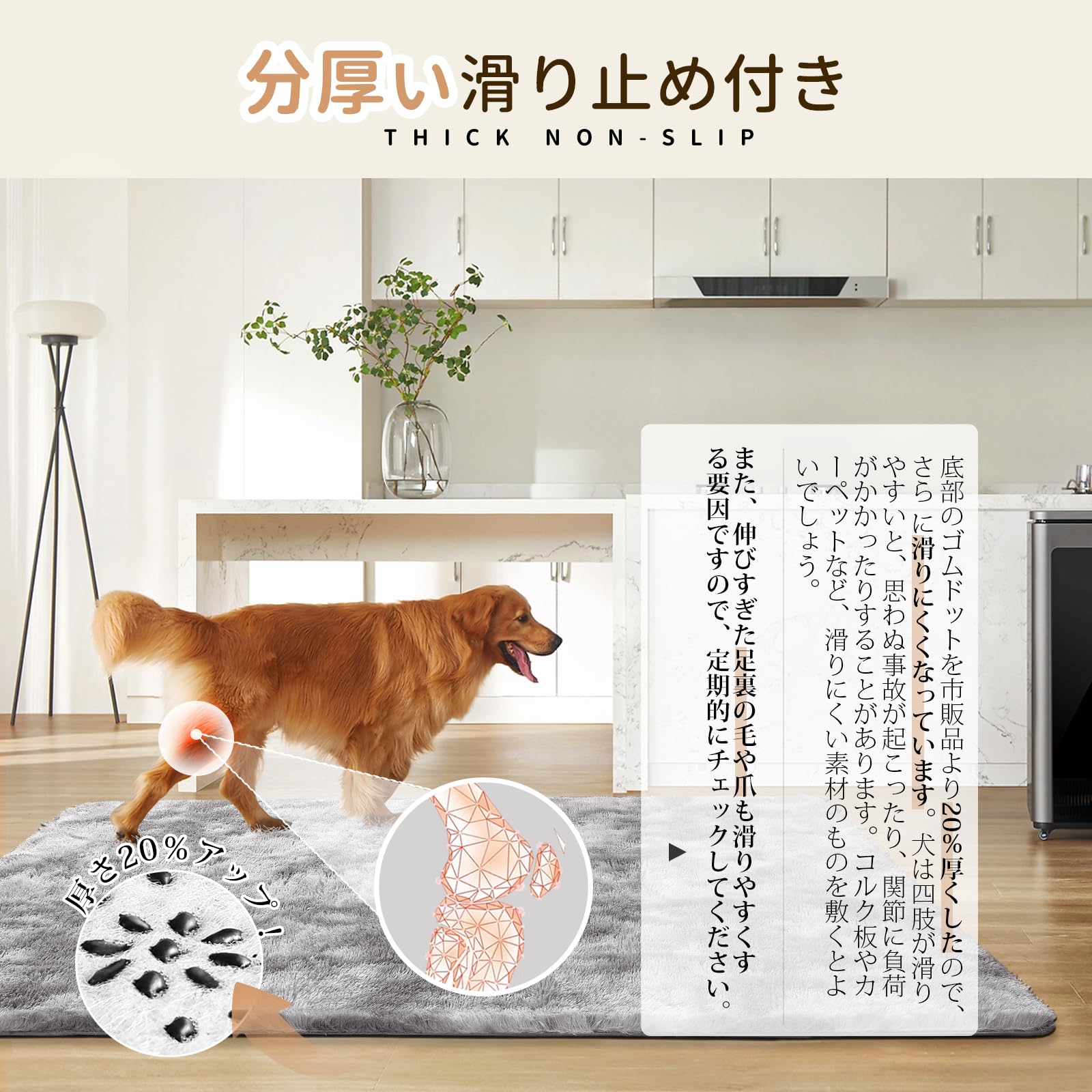 【滑り止め20%アップラグ】お子様や高齢者、ペットのいるご家庭の安全を確保するために、特別にゴムドットの厚みを強化しました。これにより、高齢者がカーペットの上を歩く際に滑る心配をせずに安心して歩けるようになり、お子様が遊ぶ際もより安全に走り回ることができます。また、犬が膝蓋骨脱臼を起こして動物病院に行く回数も減らすことができます。