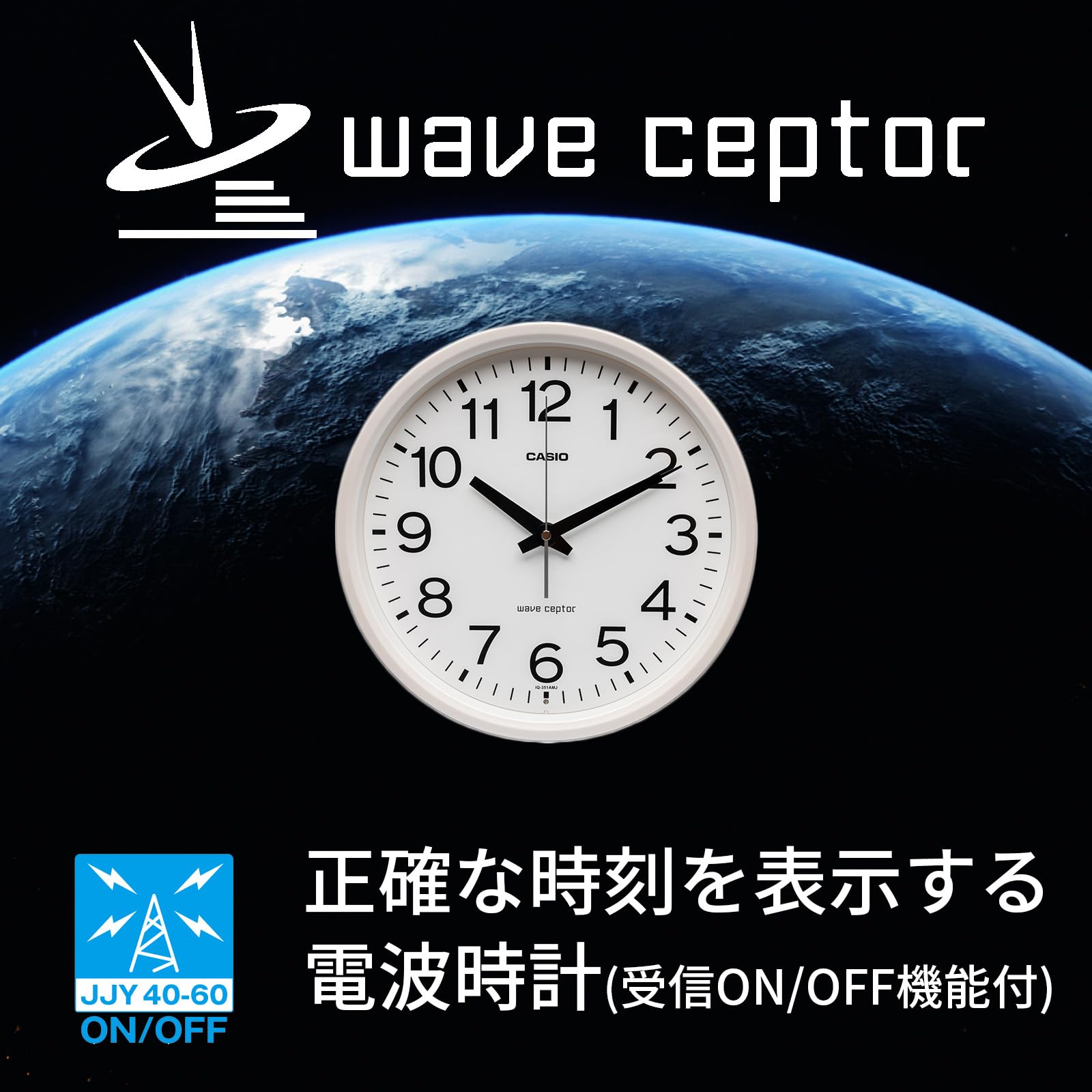機能:電波受信機能 (自動受信/手動受信)、電波受信ONOFF機能、電波受信ランプ、秒針停止機能 (明暗判定センサーによる)、ステップ秒針