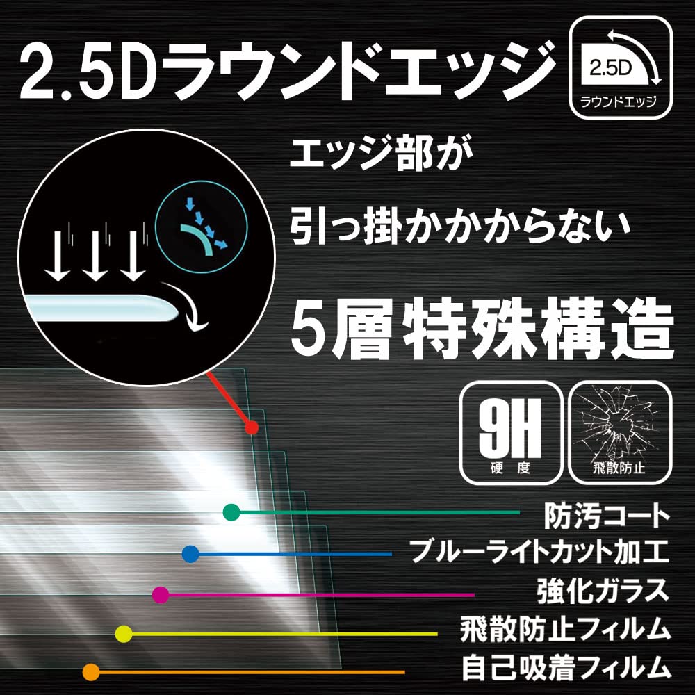 【高強度】2.5Dラウンドエッジ加工でガラスの縁の欠けや破損から保護。5層のレイヤー加工で硬度9H、国産AGCガラスで、鋭利な傷から保護、飛散防止加工でガラスの飛び散りを防ぎ液晶破損とケガから保護。