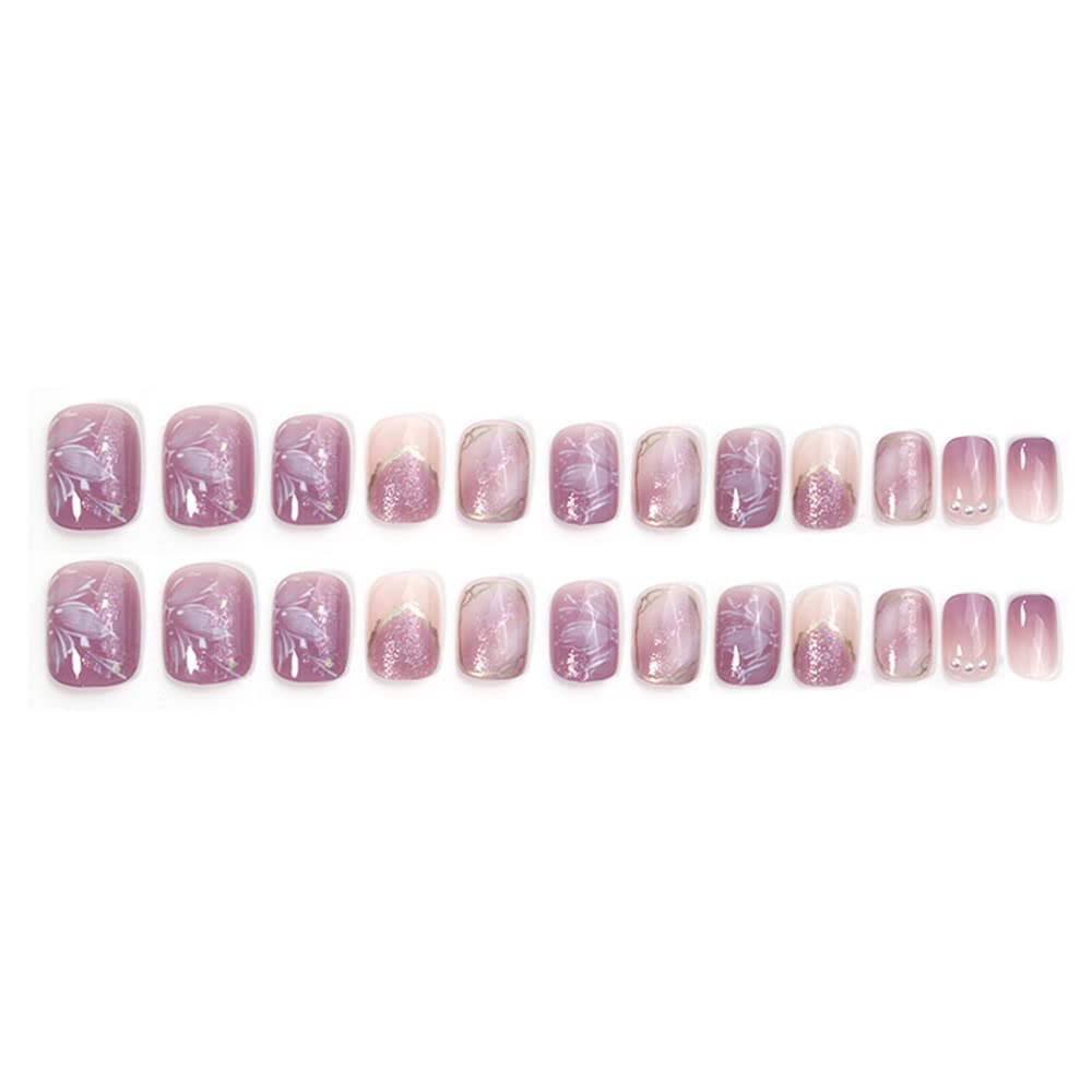 ネイルチップ ショート 24枚入 簡単 ジェルネイル ネイルシール かわいいパープル つけ爪 ネイル ビーズ 落ち着いていた紫 人気 韓国 ネイル用品 両面テープ48枚付き (カメリアとビーズ)