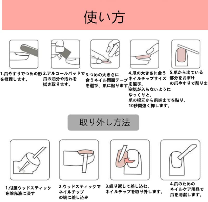 【長持ち】ネイルチップは、ジェルネイルのように長時間持続します。普段の生活で、何日もキレイな爪を楽しむことができます。ネイル接着用両面テープ48枚付属、繰り返して利用可能です。