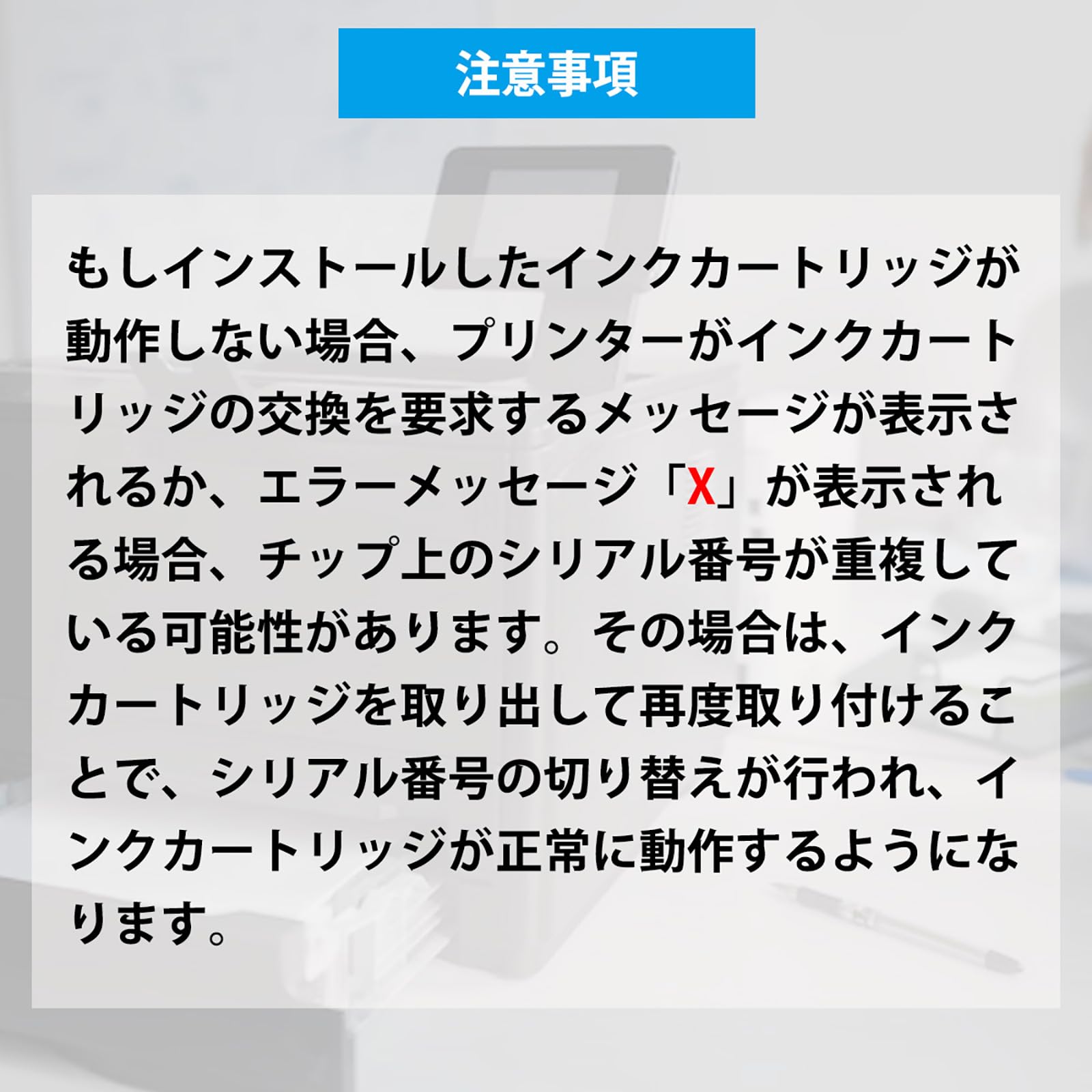 1.注意事項:もしインストールしたインクカートリッジが動作しない場合、プリンターがインクカートリッジの交換を要求するメッセージが表示されるか、エラーメッセージ「X」が表示される場合、チップ上のシリアル番号が重複している可能性があります。その場合は、インクカートリッジを取り出して再度取り付けることで、シリアル番号の切り替えが行われ、インクカートリッジが正常に動作するようになります。