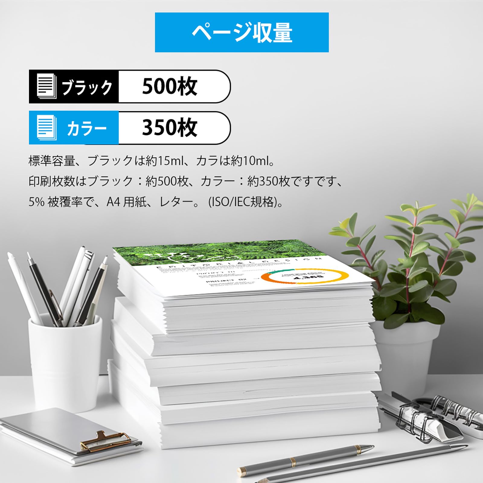4.ページ収量:標準容量、ブラックは約15ml、カラは約10ml。 印刷枚数はブラック:約500枚、カラー:約350枚ですです、5% 被覆率で、A4 用紙、レター。 (ISO/IEC規格)。