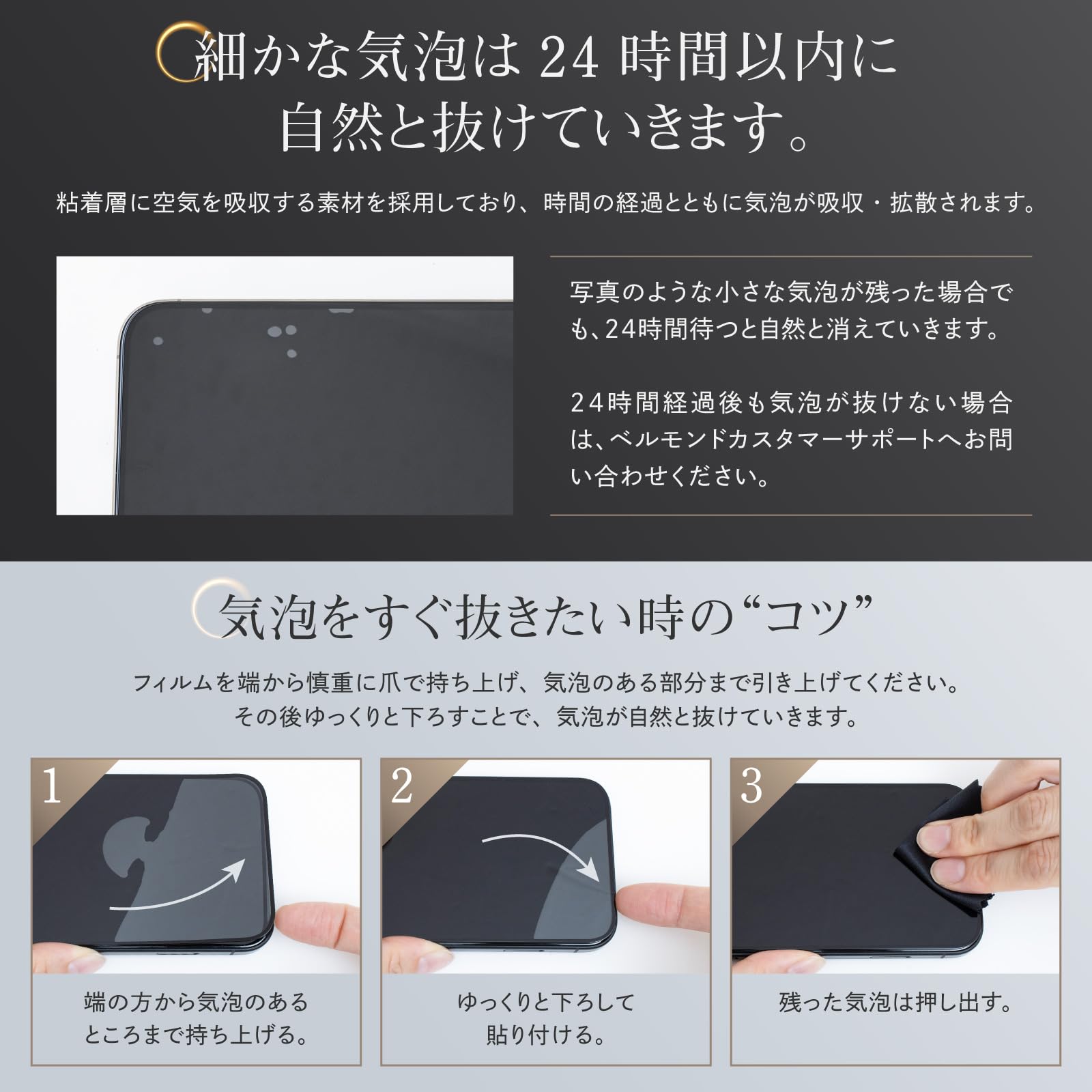 【ホコリ除去】フィルム貼りの天敵であるホコリの侵入に対応するため、「ホコリ除去シール」、「静電気防止シリコン」の2つの方法でホコリの侵入を防ぎます。ホコリが入ってしまった場合は、ベルモンドまでお知らせください。【貼り付け応援キット】拭き上げキット、取扱説明書、動画マニュアルを同封し、手順通りに作業するだけで簡単に貼り付けが可能です。