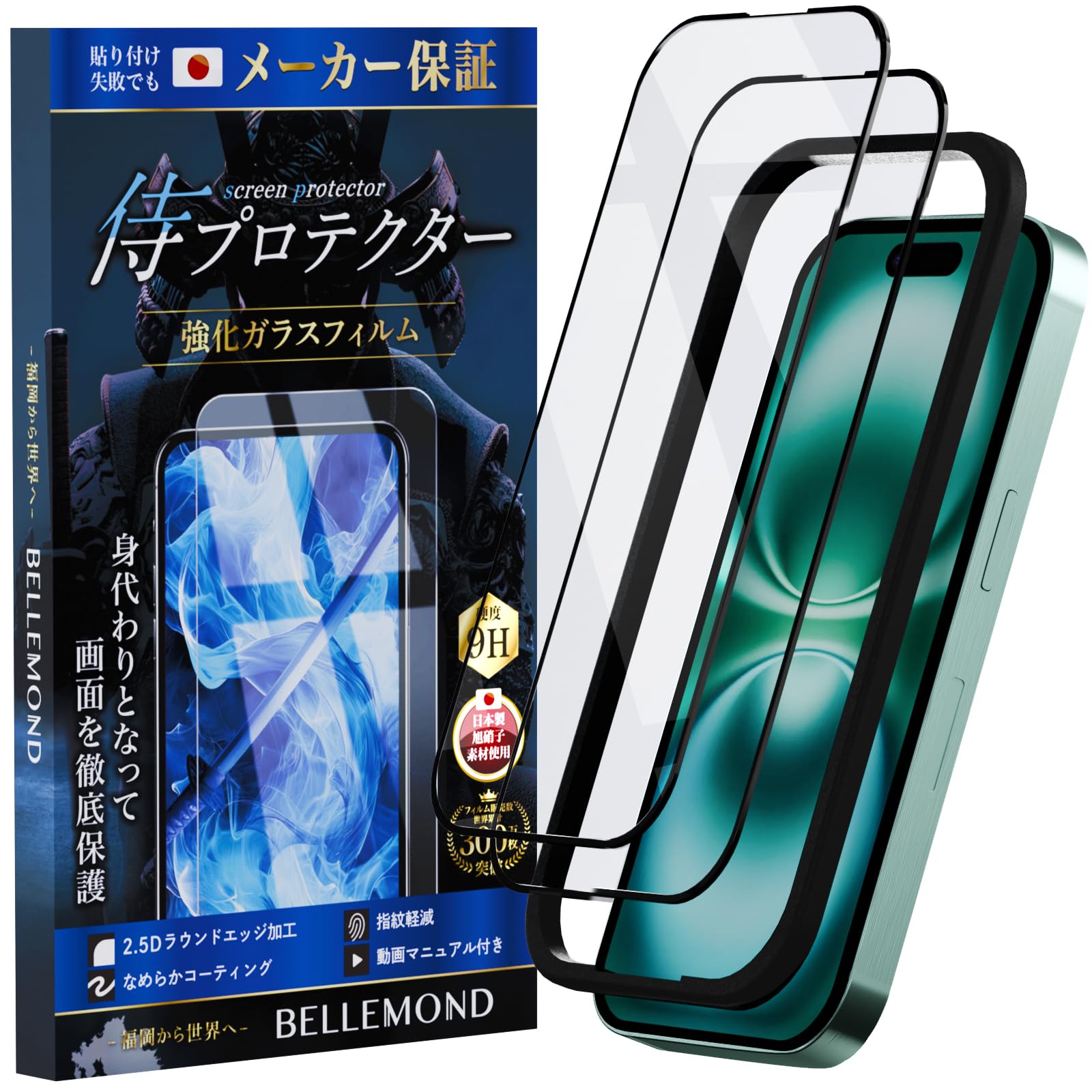 侍プロテクター iPhone 16 Plus / 15 Plus 用 クリア ガラスフィルム | 2枚セット ガイド枠付き 旭硝子素材 黒縁あり 全面保護 | 貼りやすい アイフォン16 プラス / 15 プラス 用 保護フィルム ベルモンド B1351