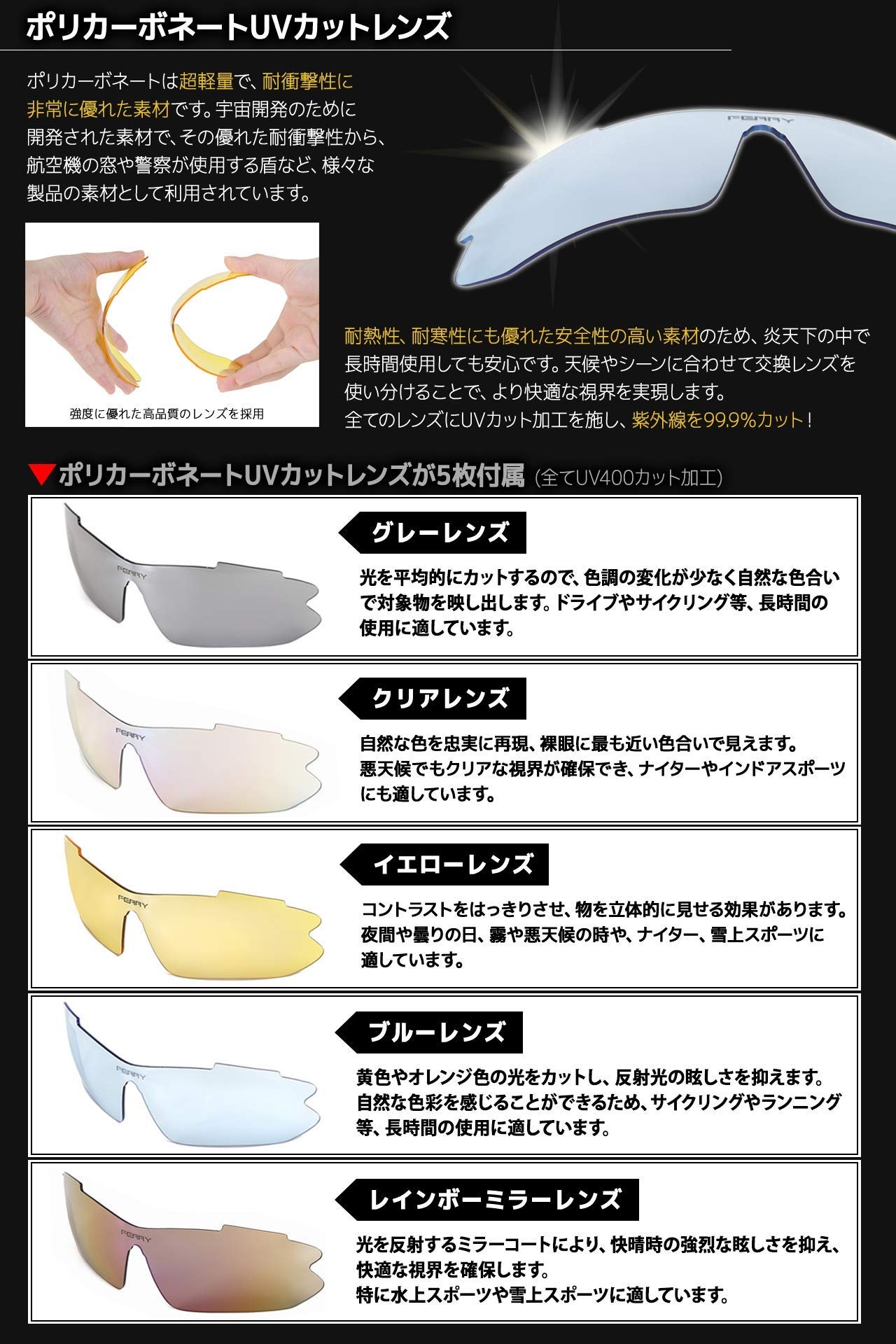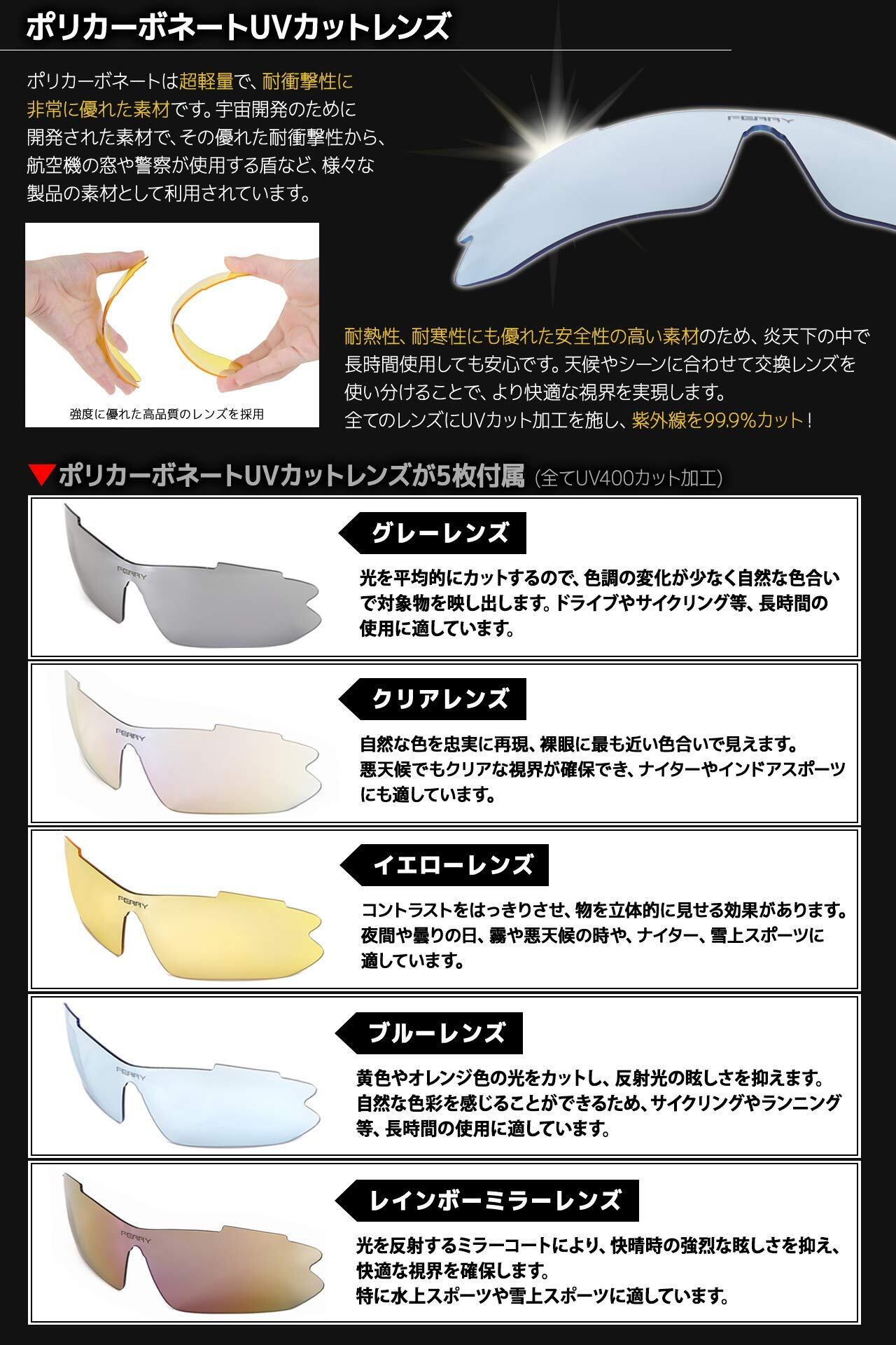 UVカットミラーコートレンズ採用したスポーツサングラス。専用交換レンズ5枚、フレーム2本セット。