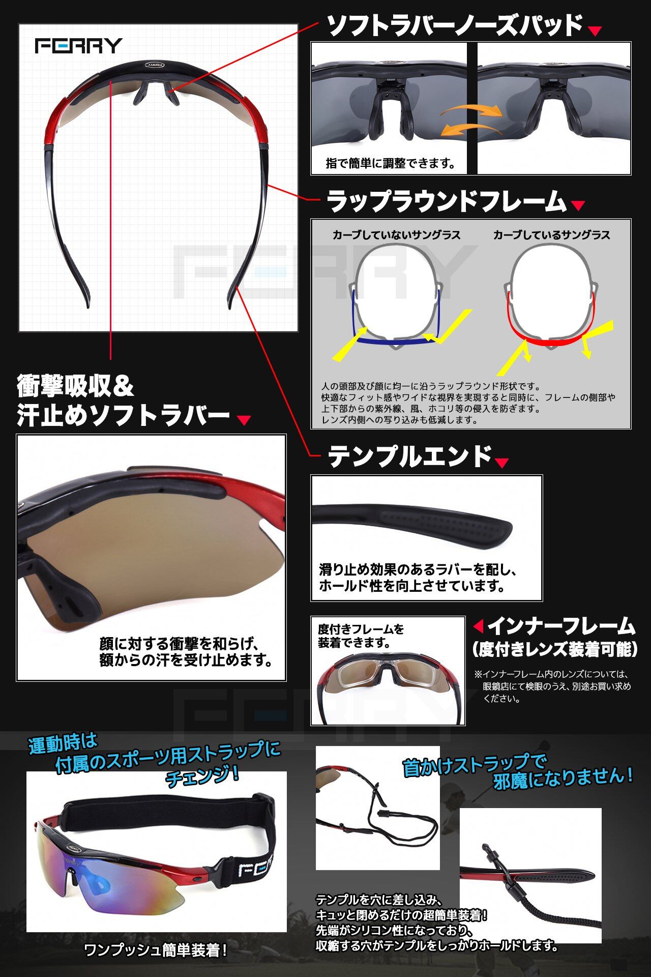 テンプルをスポーツ用ストラップに交換することでゴーグル仕様になり、ハードなスポーツシーンにも対応。脱着式インナーフレームに度付きレンズを装着可能。