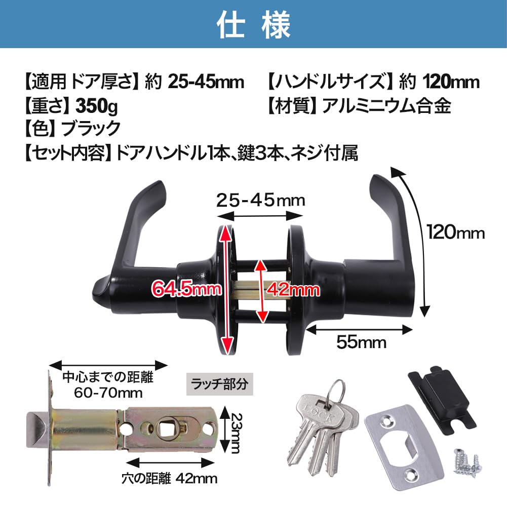 【適用ドア厚さ】約 25-45mm 【ラッチ】約 60-70mm【ハンドルサイズ】約 120mm【重さ】350g【材質】アルミニウム合金【色】黒【セット内容】ドアハンドル1本、鍵3本、ネジ付属