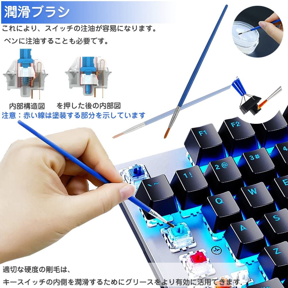 注油用ブラシが付属しています。 適度な硬さのブラシを使うと、キー軸スイッチの内側にうまくグリースを塗布することができます。(潤滑ペンはあくまで筆記用具です。完璧な潤滑を提供しますが、筆先が小さすぎてキーボードを掃除することはできません。)