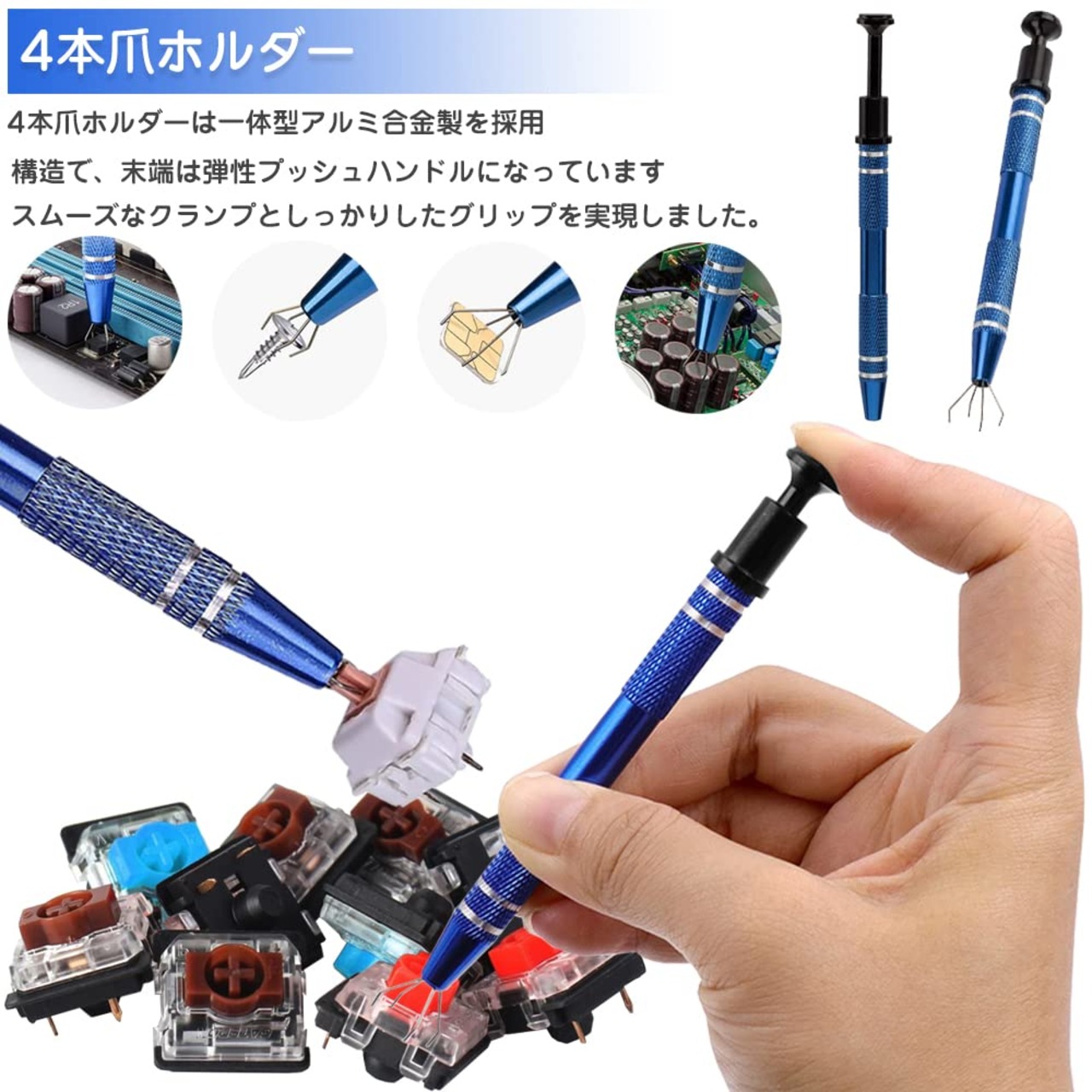 セット内容:4点セット(キープーラー1個、U字型シャフトプーラー1個、潤滑ペン1本 、4本爪ホルダー1個)初めてキーボードを作る人も、メカニカルキーボードのファンも、これらを使ってキーボードをカスタマイズしてみてはいかがでしょうか。
