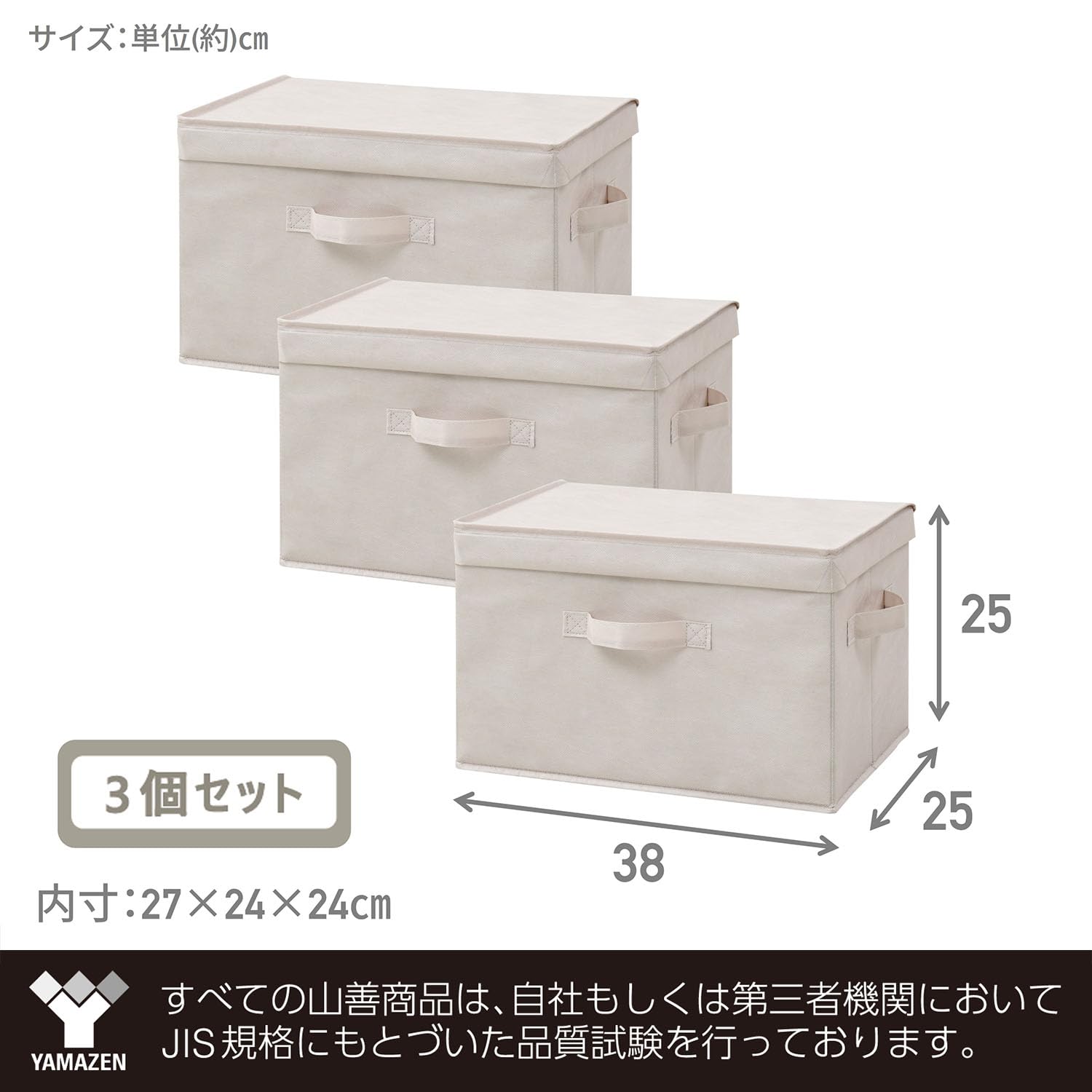 ●3個セット●本体サイズ:幅38×奥行25×高さ25cm●材質:ポリエステル、紙●品質:東証プライム(株)山善で扱うすべての商品は、国内の第三者機関において、JIS基準に基づいた試験に合格しております。