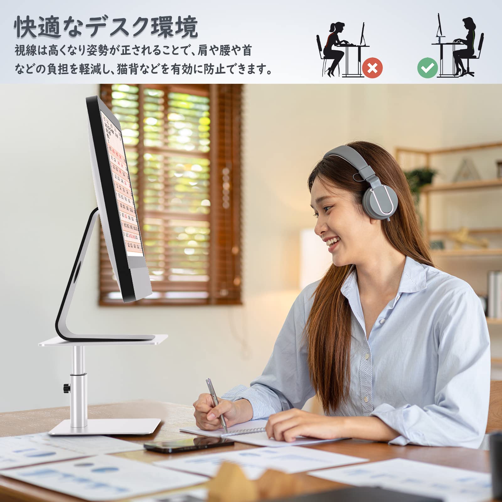 【高さ調整●作業効率アップ】モニタースタンドは支柱のネジ一つで高さを11〜17cmまで稼働します。お使いの机と椅子の高さにあわせて最適な目線にディスプレイの高さを調整することができます。高さが目線に調節できることにより、姿勢がよくなって腰と首の痛みが解消でき、テレワークが快適になり、作業効率も格段に上がります。高さ調整中ネジ締め不足なら、安定性に影響があるのでご注意ください。