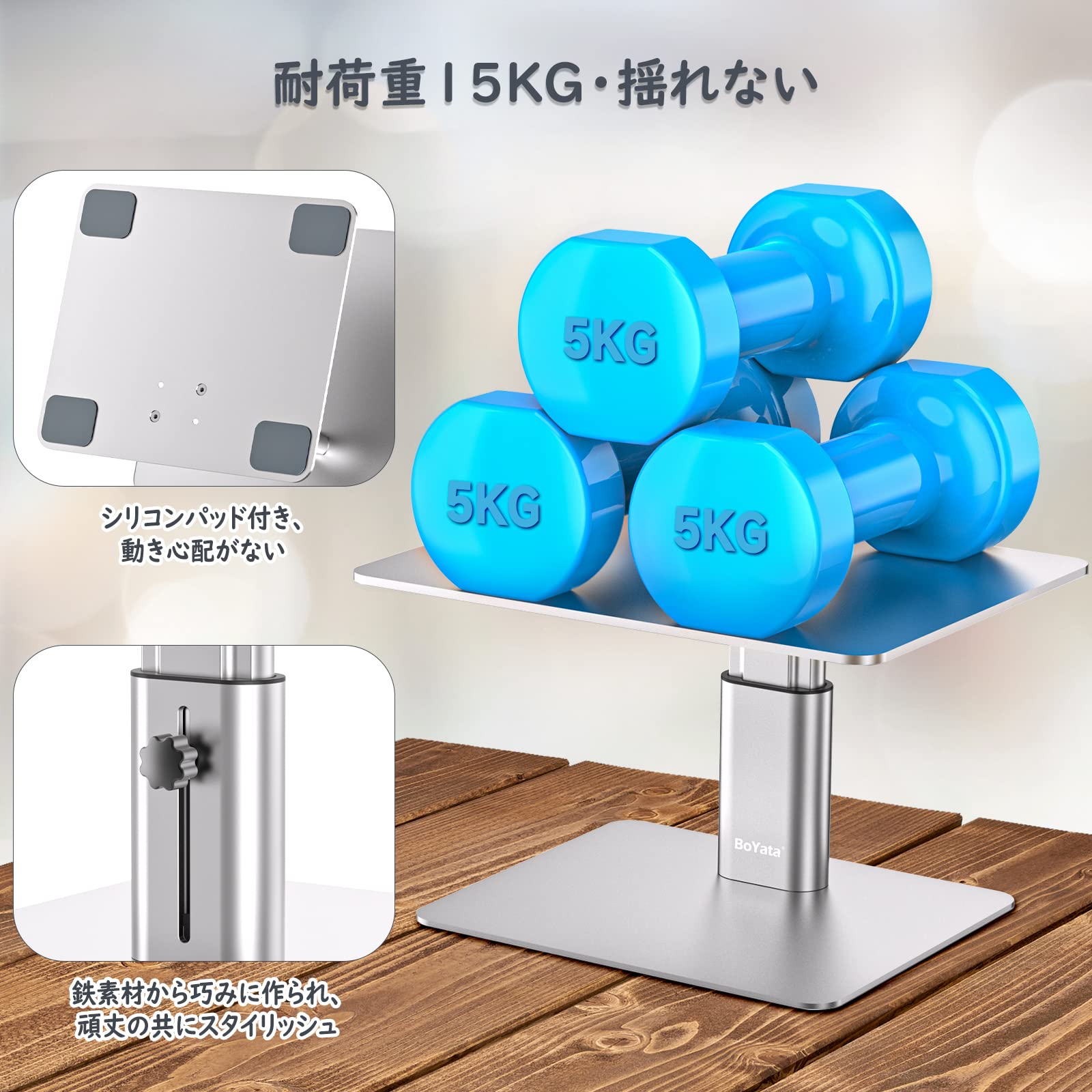 【安定性抜群】BoYataモニター台は重厚な鉄の素材なので安定性が抜群、最大まで15kg耐えられます。板のねじ穴は表裏やネジかピンで精工に加工されており、しっかり剛性と精度が取ることができました。モニター台の底部の四隅に滑り防止ゴム付き、グリップ力はしっかりしており、押しても動くことはありません。●安定性のために、モニタースタンドの支柱とモニターの支柱を一直線上における位置にモニターを設置することをおすすめします。