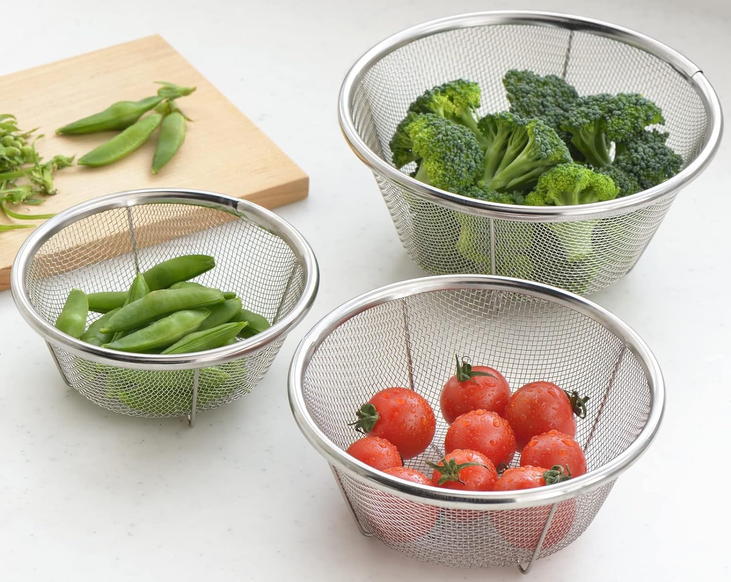 小さな果物や野菜の水切り、一時置きに便利なミニサイズのザルセット。水切れが良く、お手入れも簡単。丈夫でさびにくいステンレス製。